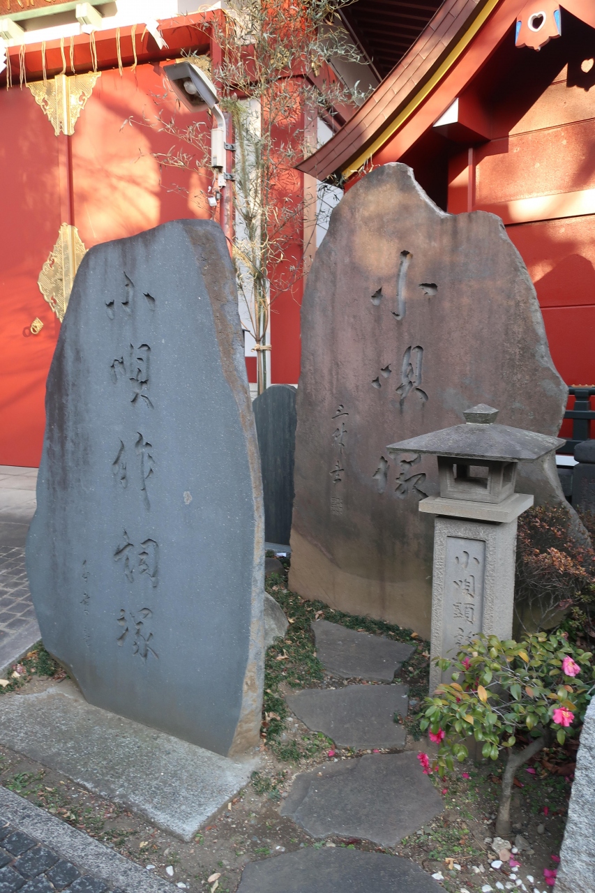 神田明神の御神殿の裏面側、裏参道の途中に小唄塚 小唄作詞塚があります。江戸小唄には神田祭が所々に取り入れられ、小唄の作曲で活躍した吉田草紙庵を称える石碑です。それに併せて小唄作詞の石碑が隣に建てられました。