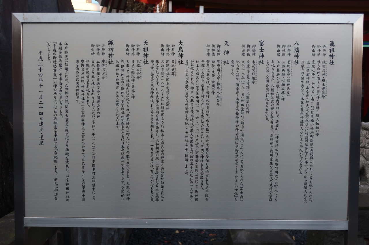 神田明神の御神殿の裏面側、裏参道の右手にある末社が籠祖神社(合祀殿)です。籠祖神社の境内に誉田別命を祀る八幡神社、木花咲耶姫命を祀る冨士神社、菅原道真命・柿本人麻呂命を祀る天神社、日本武尊を祀る大鳥神社、天照大御神を祀る天祖神社、建御名方命を祀る諏訪神社が合祀されてます。一参りするといっぺんに七つの御利益を得られる有り難い神社です。それ故か、意外とお参りするのに並んでました。
