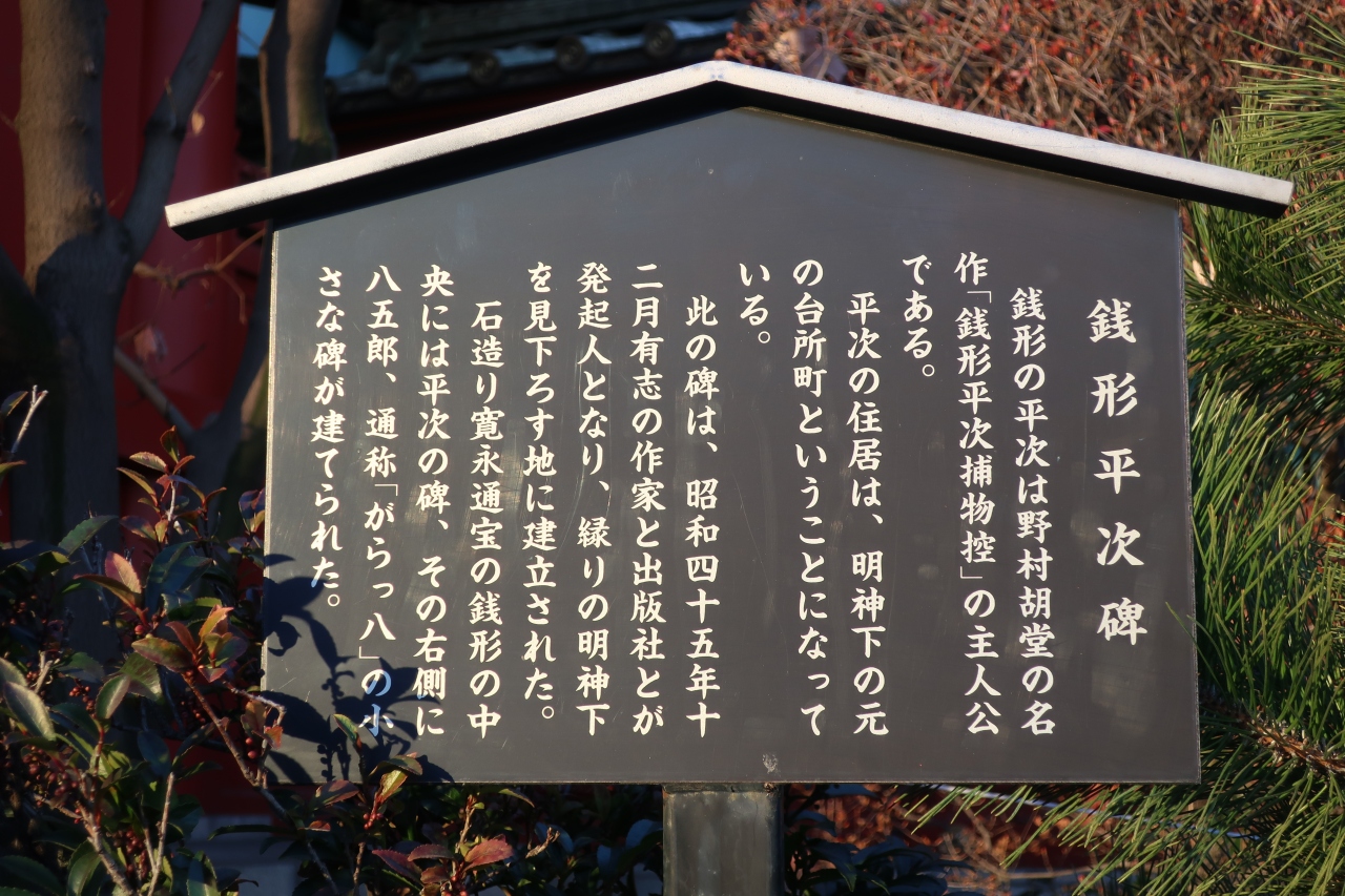 銭形平次と言えば北大路欣也等のテレビドラマで知られますが、神田明神下に住んでいる設定になっています。それに因んでこの石碑は建てられたそうです。銭形平次は知っている人も多く、記念撮影をする人が多く人気です。