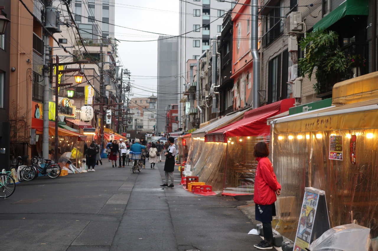 仲見世から伝法院通りを抜けた先を北に行ったところがホッピー通りです。通りに並ぶ大衆酒場からは昼間っからホッピー片手にもつ煮をつまむ酔っ払いの声が聞こえて来ます。昼間っから、酔っぱらえるとは羨ましい限りです。