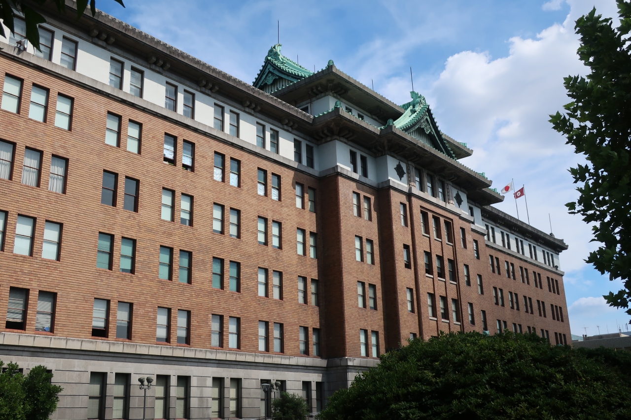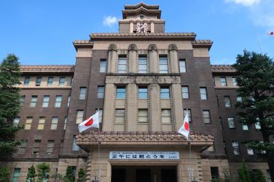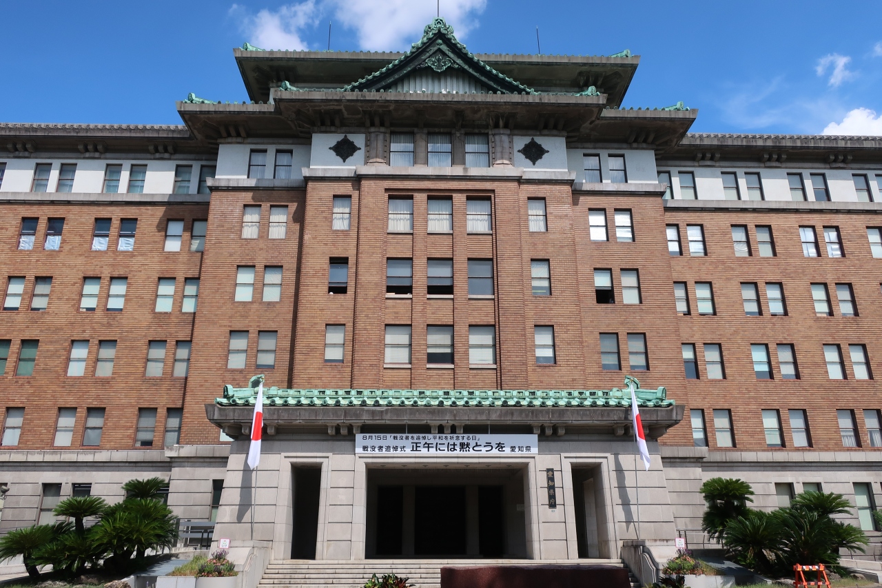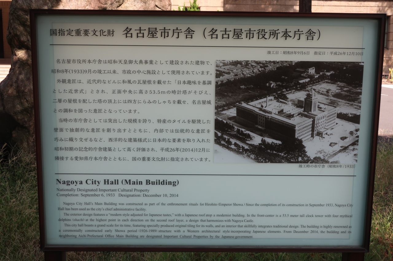 愛知県本庁舎の右手に建つ同じく帝冠様式が美しい建物が名古屋市役所本庁舎です。昭和8年に建てられた建物の中央には時計塔がそびえ、外壁の装飾には細かな意匠が施されており細かな所を見るとその見事な造りが良く分かります。平日なら内部も見学できるのですが、訪れた日は閉庁日で中に入ることは出来ず見られませんでした。映画やドラマの撮影で良く使われる場所なので、見られなかったのは残念です。