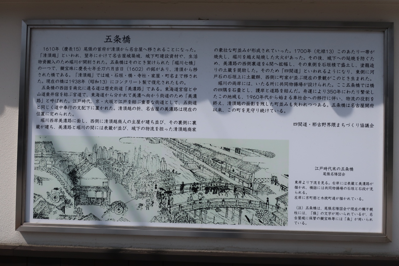 堀川に掛かる五条橋の西側に500m程続く商店街です。明治20年から続く商店街には古びた鉄骨造りのアーケードが掛かりレトロ感たっぷりの雰囲気がたまらない魅力。人通りも多くはなく、店先から子供が飛び出て来そうです。