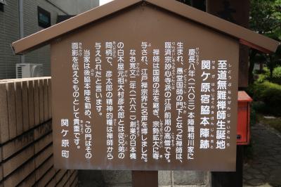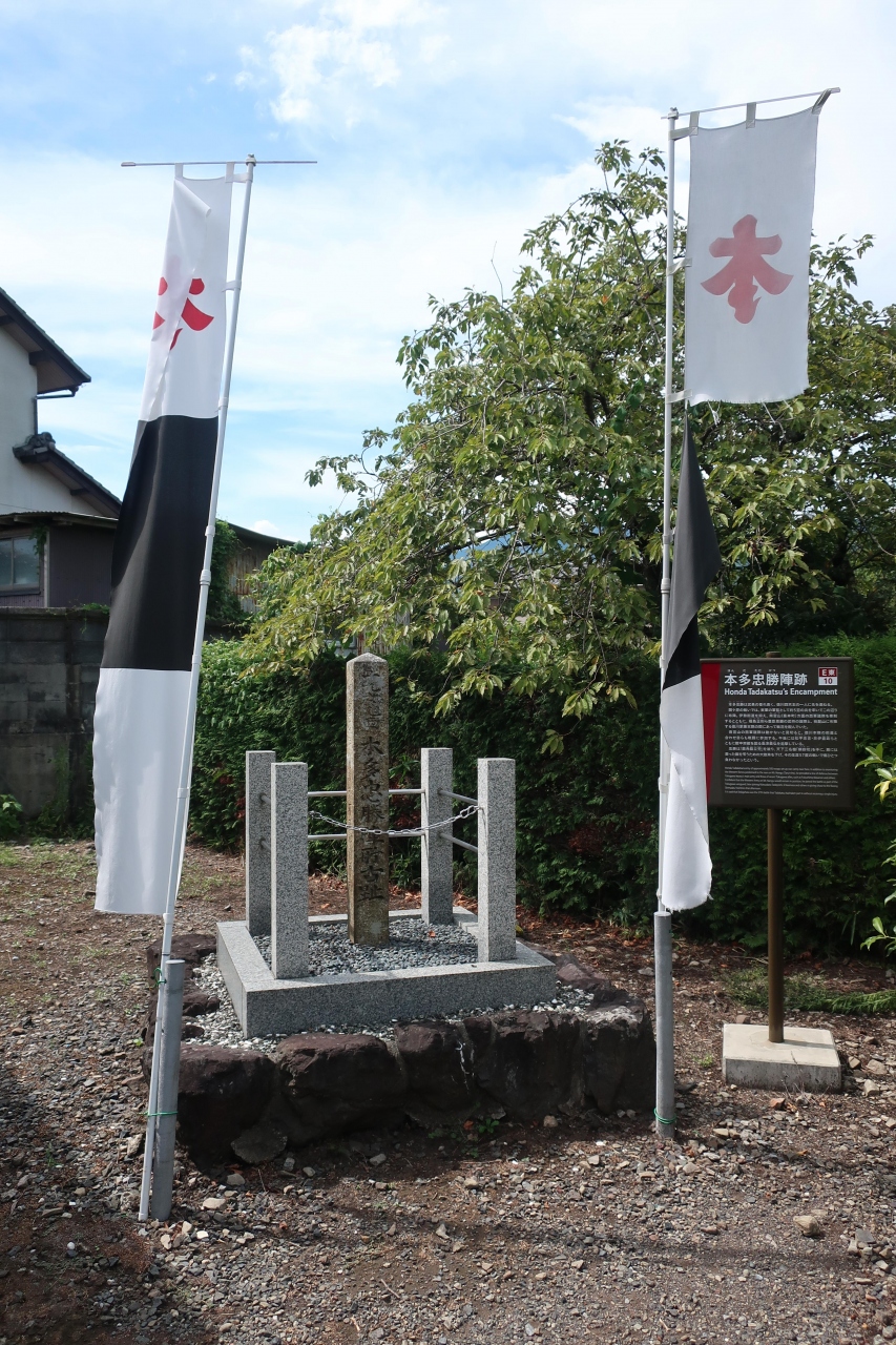 関ケ原駅の南側、十九女池公園から250m程の所に、家康方についた武将 本田忠勝の陣跡があります。地図を片手に行ってみると、分かり辛い所にありました。駐車場と民家の間の細い道を進んだ民家の裏庭の様な民家に囲まれた小さな敷地に石碑と幟が建てられています。石碑も小さいですが説明版も建てられ整備されています。