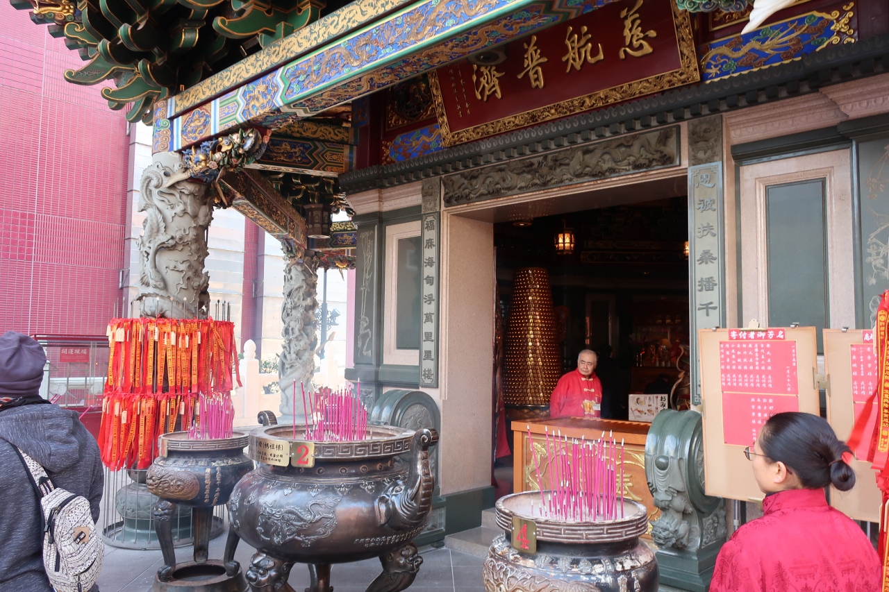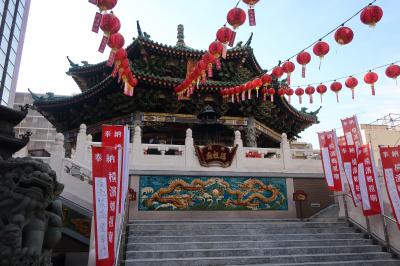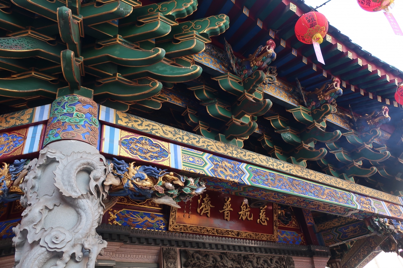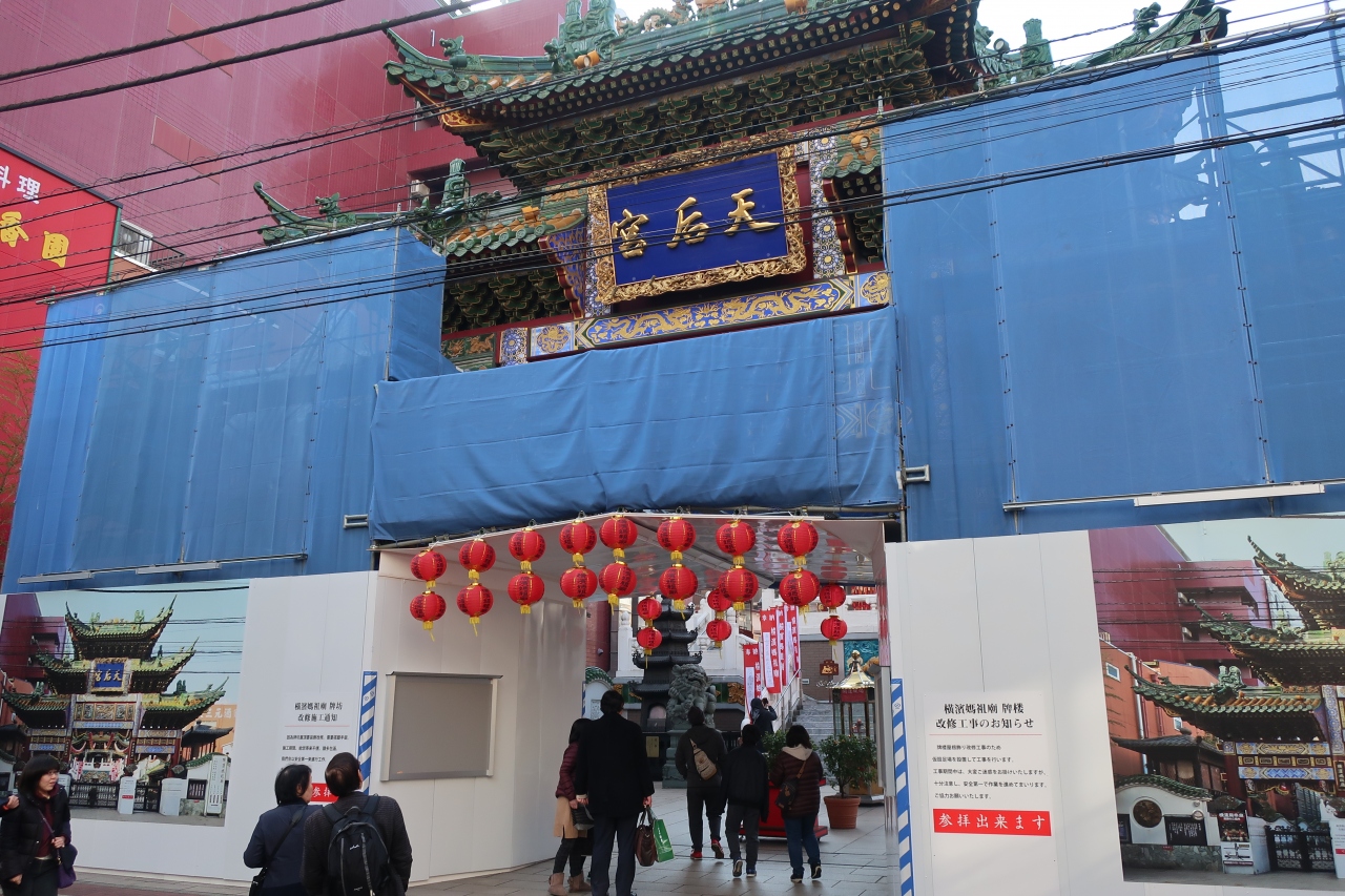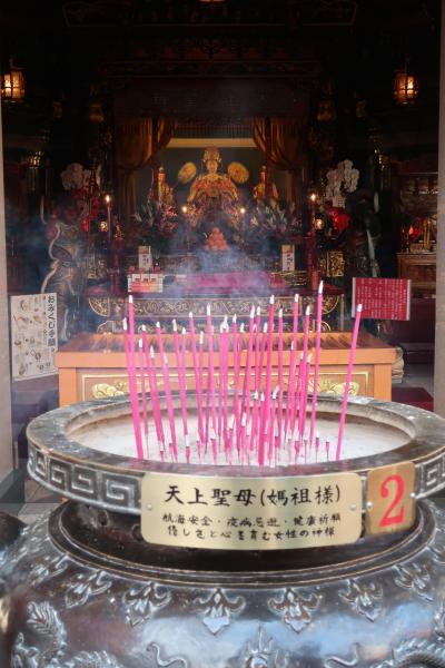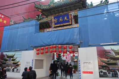 横浜中華街の南門シルクロードの横浜大世界の近くに横濱媽祖廟はあります。訪れてみると表は白いフェンスとブルーシートで覆われ工事中でしたが、工事は正面だけでした。航海安全を護る媽祖を祀っており八角形の中華寺院からは赤い提灯が連なって下げられ中々良い雰囲気。階段を上って御堂の前に行くと大きな線香が供えられ、少し待たされる程お参りの人が居ました。お堂の施された装飾も日本の寺院とは違い派手なのも面白いです。