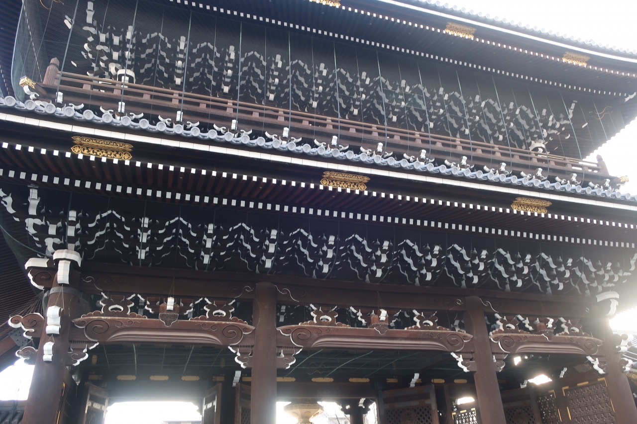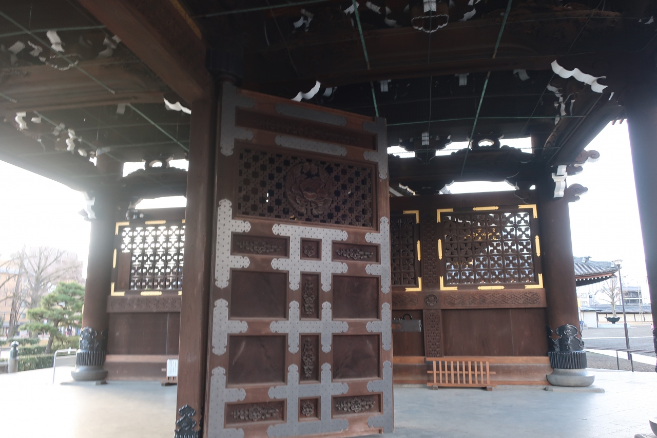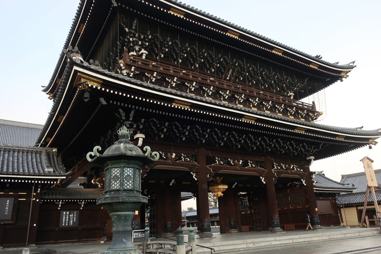 東本願寺の烏丸通り沿い北側に位置する門が御影堂門門です。こちらの門も明治期に再建された門です。京都三大門の一つに数えられる大きな門です。阿弥陀堂とは異なり、とても重厚感のある二層の山門です。烏丸通りから御影堂門越しにみる御影堂は、門の装飾、釣り燈篭とお堂が調和して見えとても見事な景観を醸し出しています。