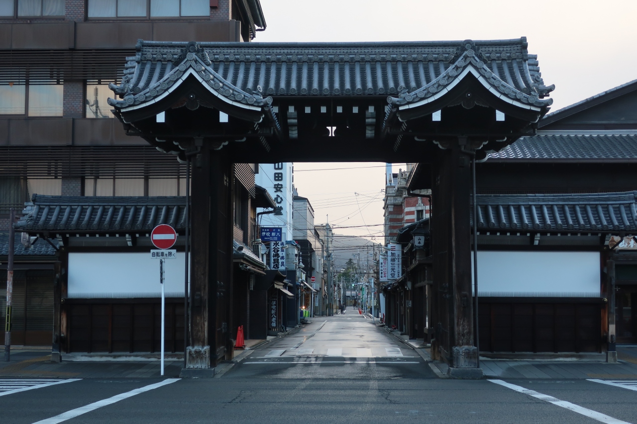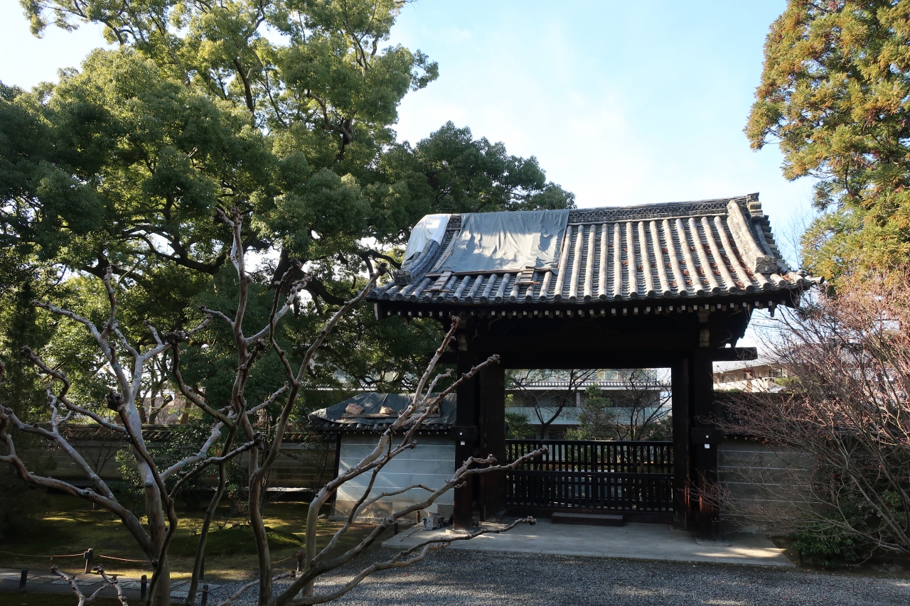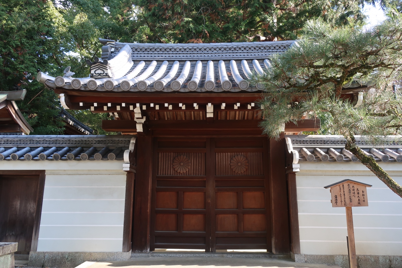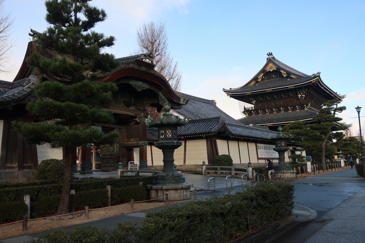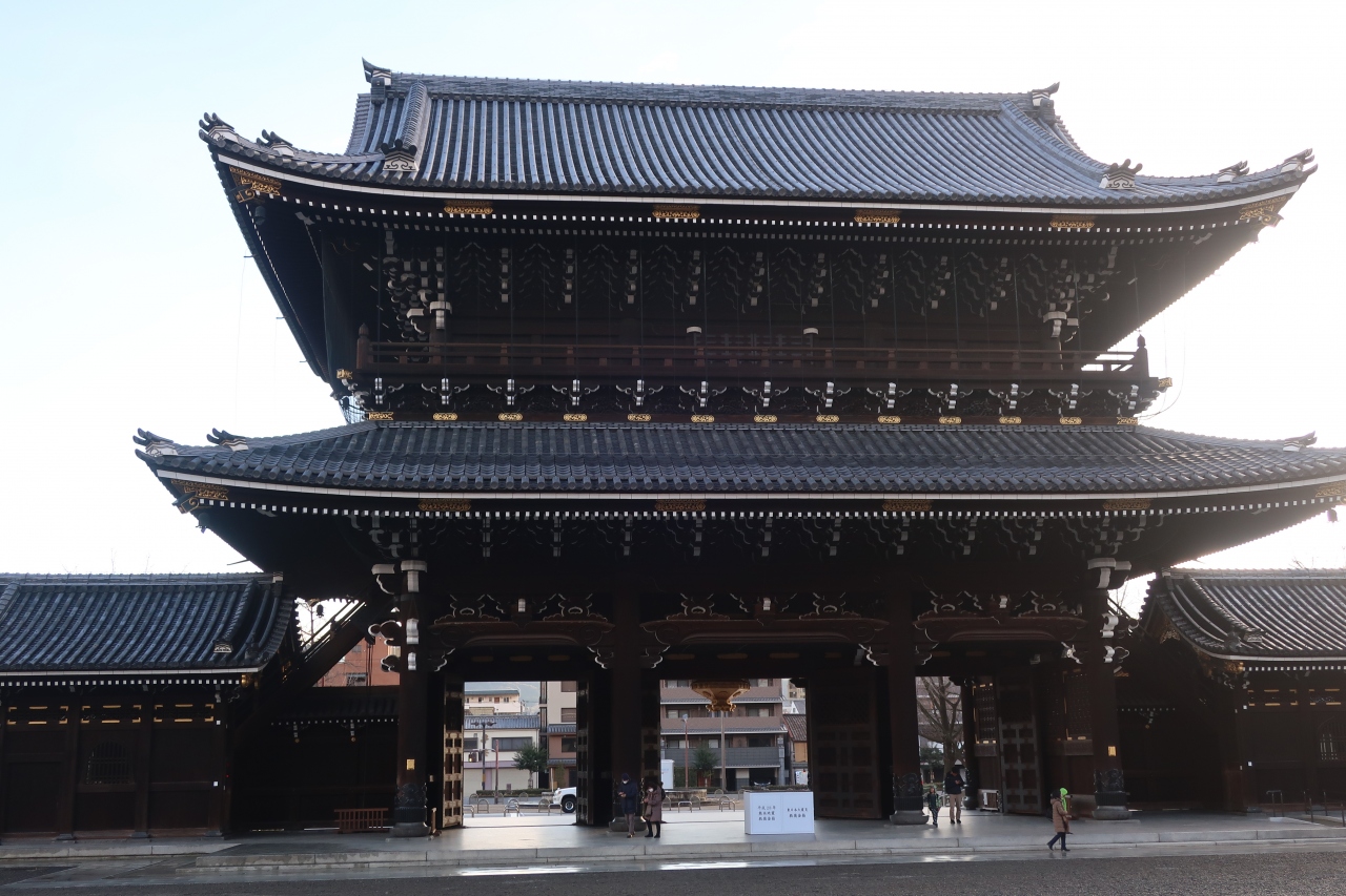 西本願寺の前を通る堀川通りの東側、正面通りの入口歩道に建つ桐妻屋根の高麗門が西本願寺 総門です。西本願寺の境内からは一つだけ離れた所に総門がありますが、ここに総門があるということは、かつて堀川通りも西本願寺の境内であったことが分かる門として貴重です。重要文化財に指定されるこの門の下を車が通り抜ける姿を見られるのは京都ならではないでしょうか。