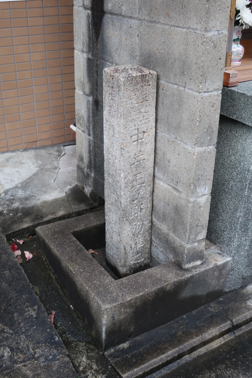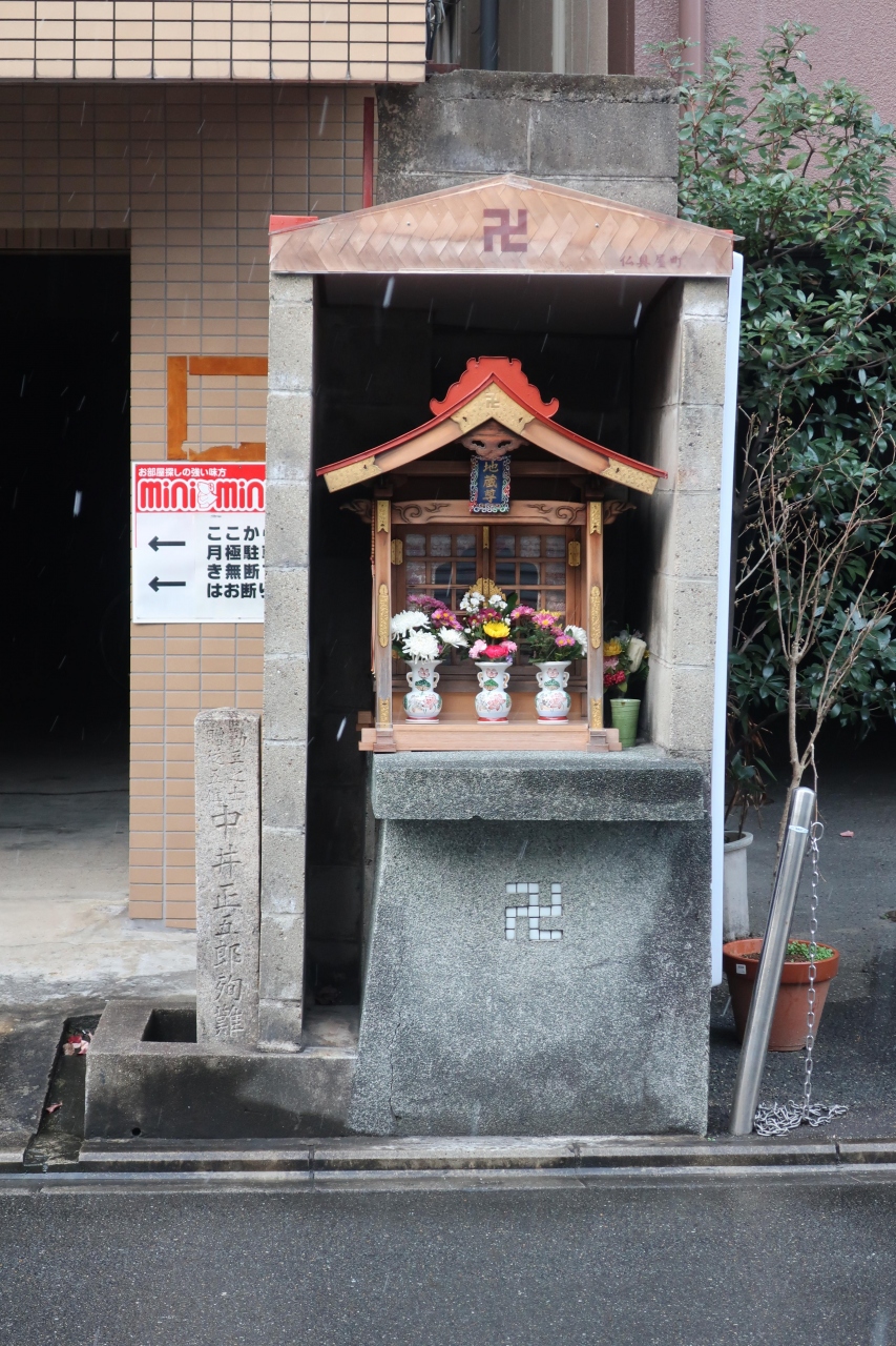 西本願寺前を走る堀川通りから東側に一筋入った油小路通り一角、壁際に「天満屋跡 中井正五郎殉難の地」の石碑が立てられています。