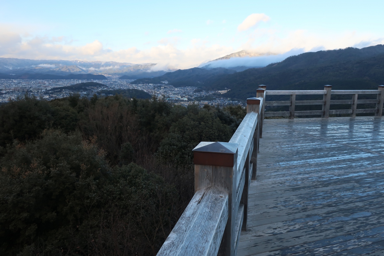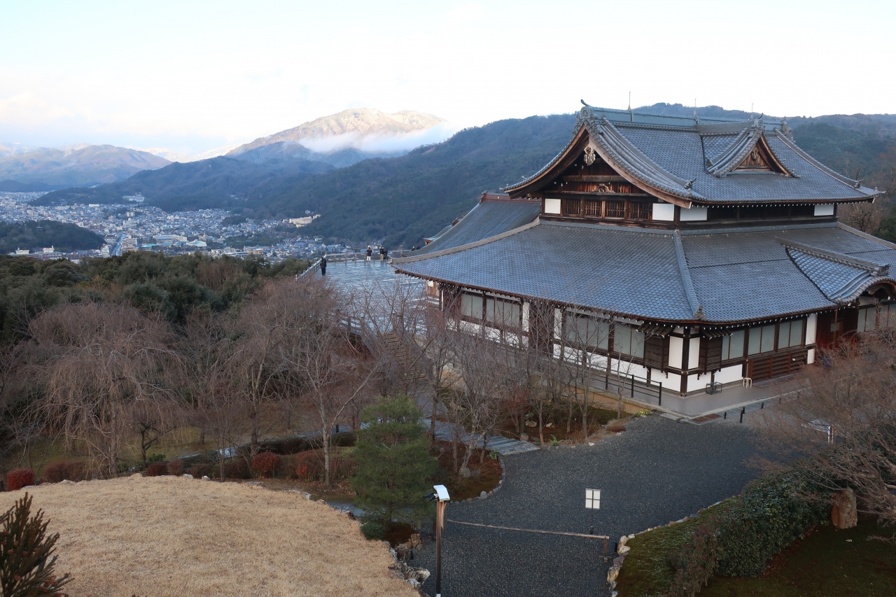 青蓮院門跡の裏山にあたる東山山頂の将軍塚に平成26年に建てられた大護摩堂が将軍塚青龍殿です。この青龍殿には木で造られた大舞台があり、ここから京都市街を一望することができます。