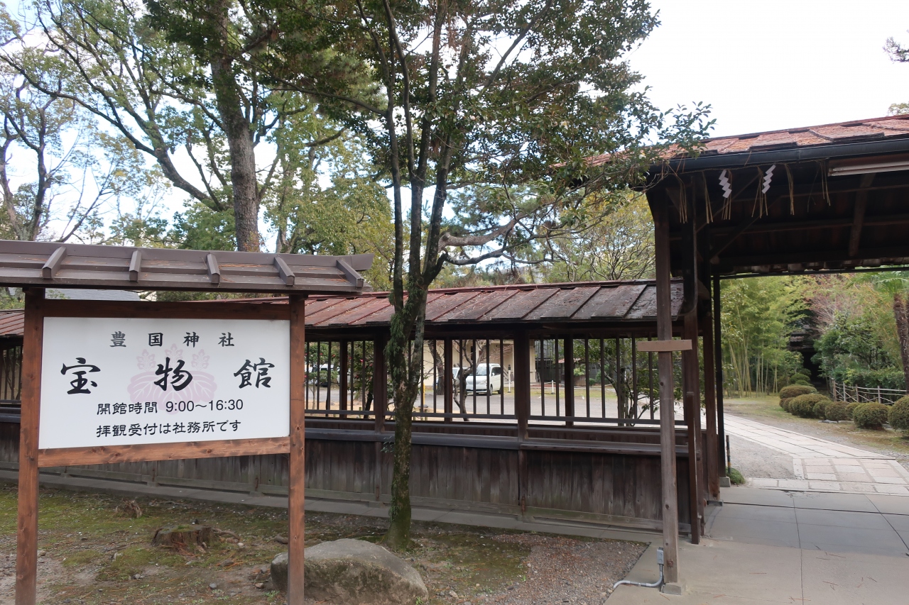 豊国神社の本殿右側(南側)を進んで行くと青銅色屋根の白い建物があります。これが豊国神社 宝物館です。宝物館の中では太閤秀吉ゆかりの品々が数多く展示されています。甲冑や刀、弓等の武具、瓢箪の馬印、そして一番の見所が豊国祭礼図屏風。京の町を沢山の人が豊国踊に熱中する姿がユーモラスに描かれており、ずっと見て居ても飽きません。これが見られだけでもここを訪れる価値があります。