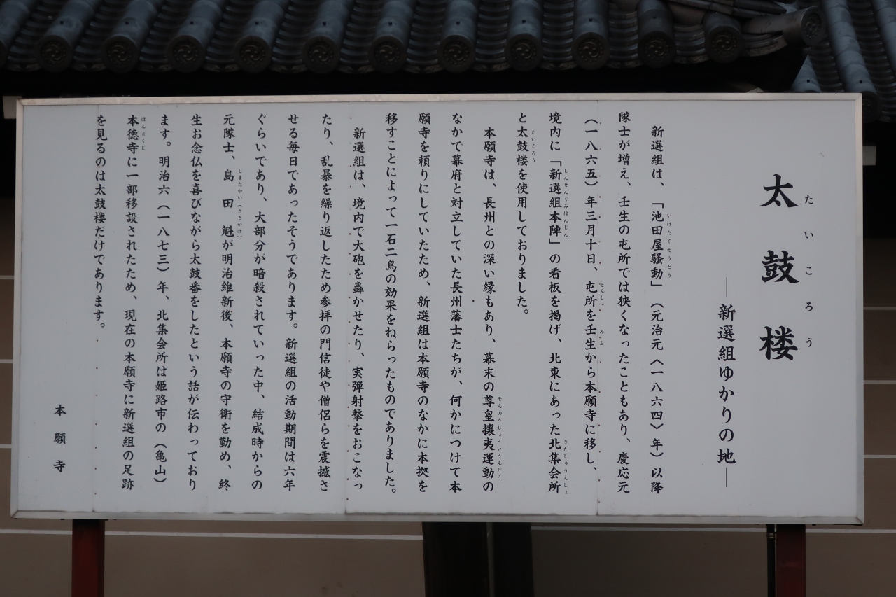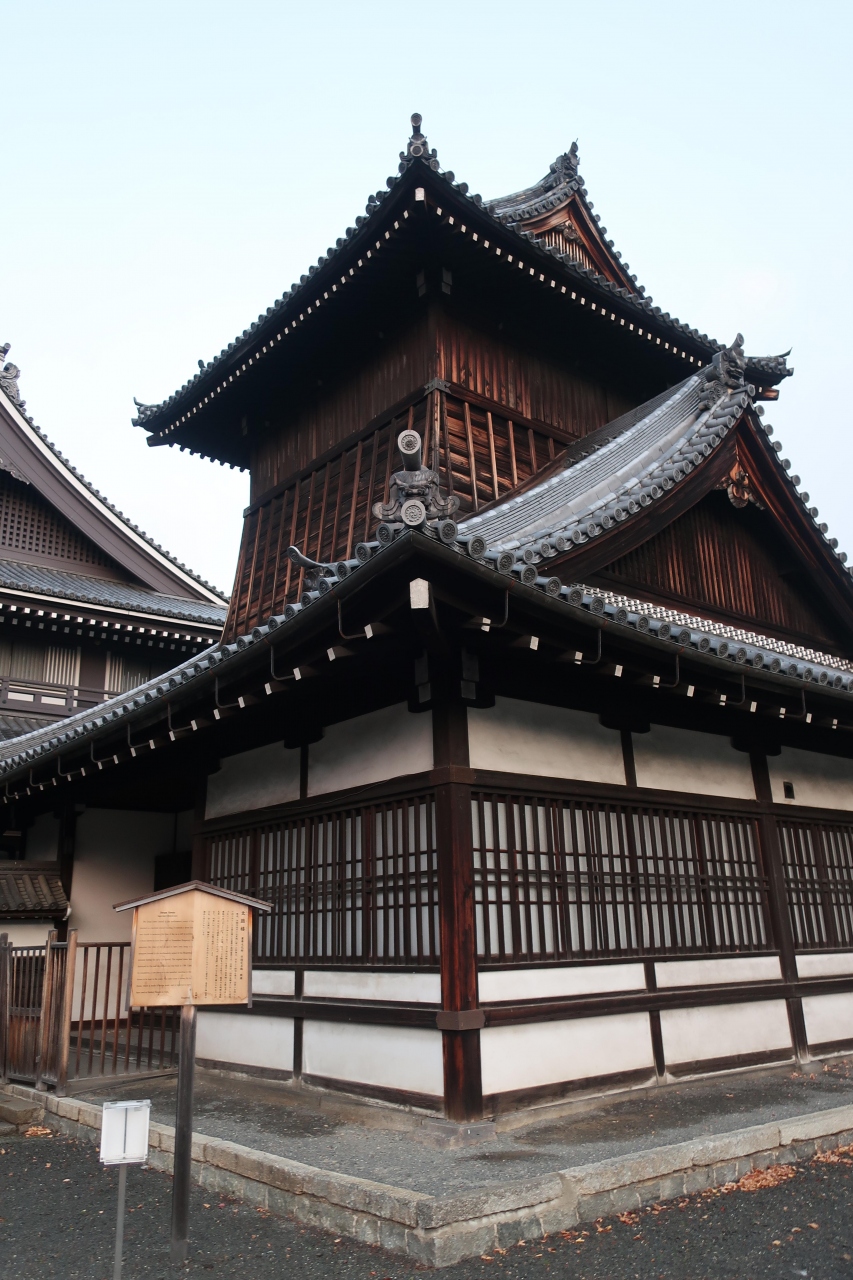 西本願寺の太鼓楼は大きさもさることながら、幕末に新選組の屯所として使われてたことでも知られています。真選組の屯所は壬生が有名ですが、壬生の後に本願寺を屯所として活動していました。西本願寺の中で新選組が使っていた建物は現在この太鼓楼だけです。内部は非公開なので見られませんが、外観は堀川通りから良く見ることが出来ます。幕末歴史好きや新選組好きの幕末歴史巡りには外せない建物です。- 旅行時期
