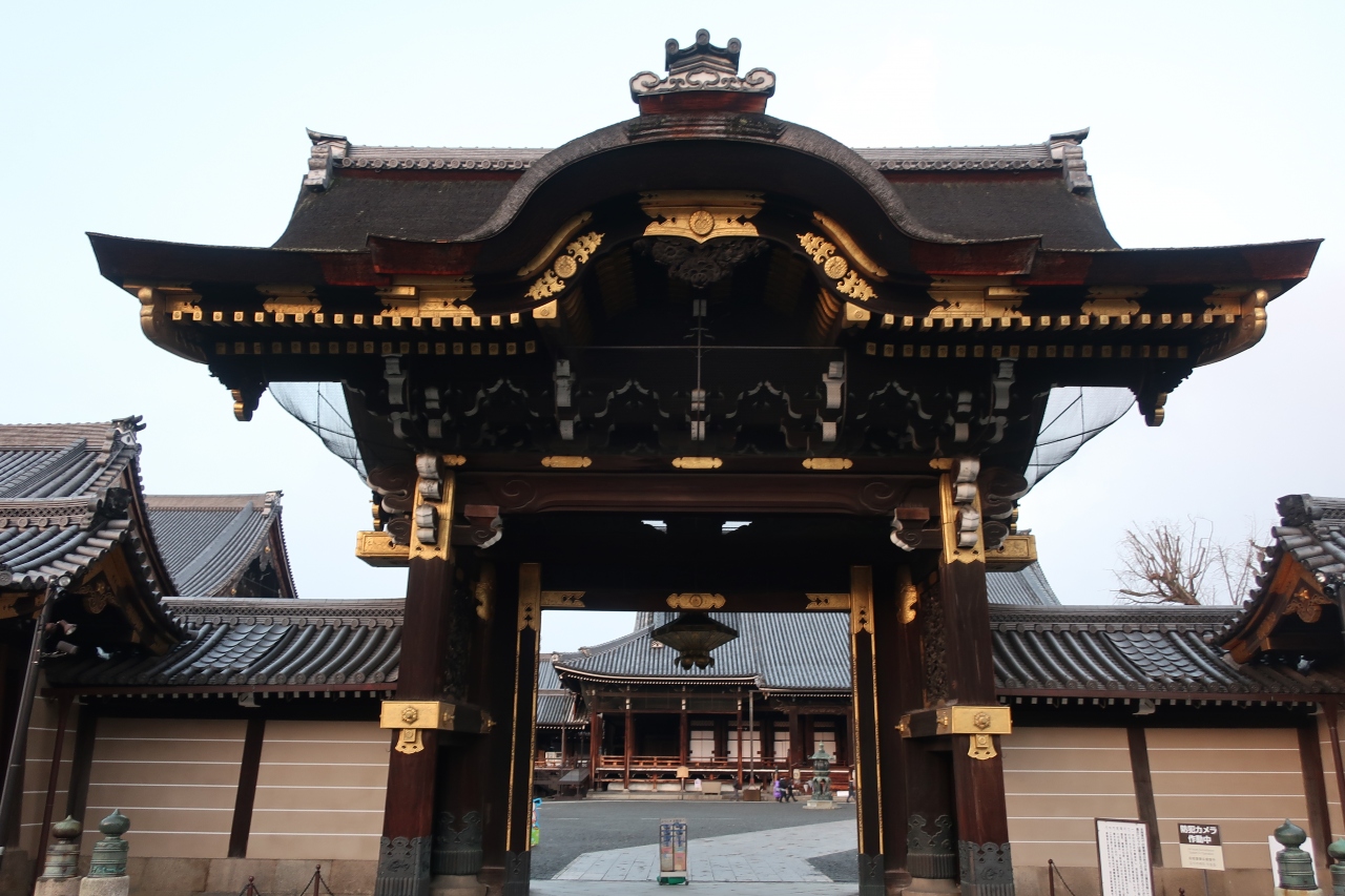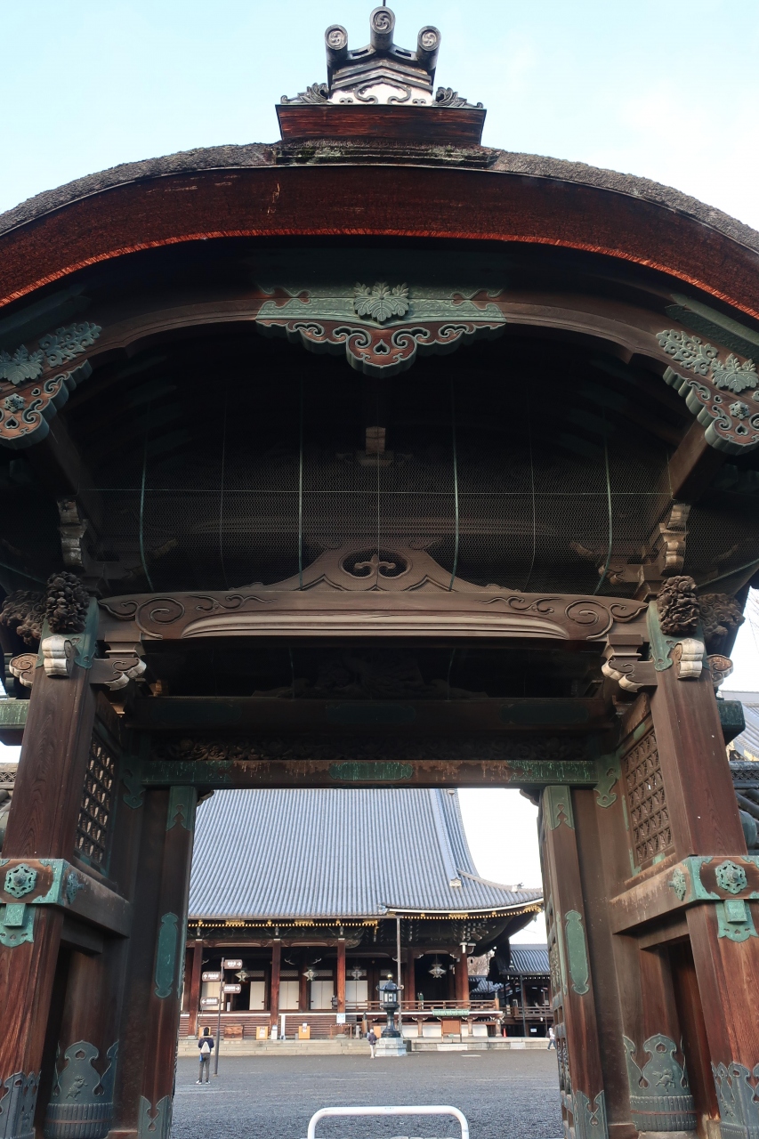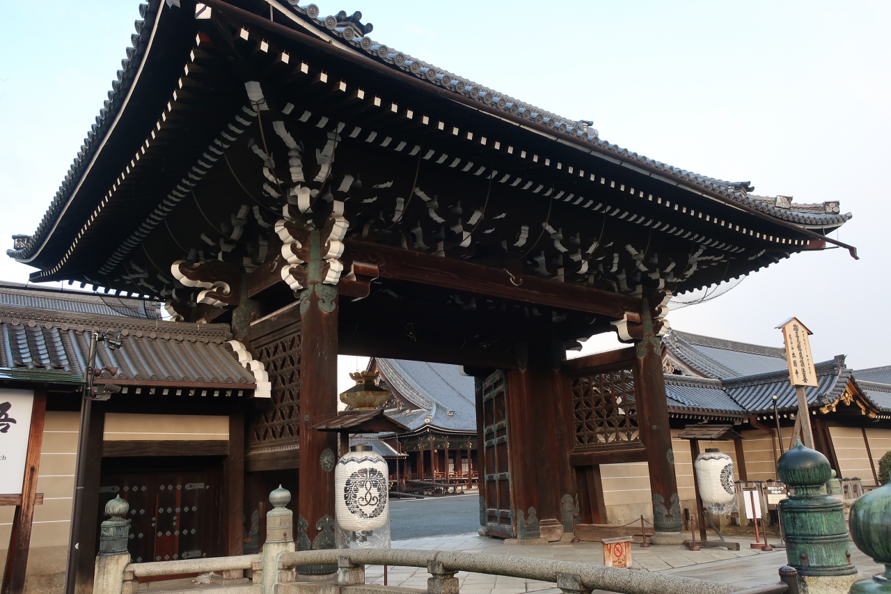 西本願寺の堀川通り沿い南側にある御影堂の正面にある門です。西本願寺の中では一番重厚感のある門です。この門の正面から中を見通すと白い目隠し塀の上に御影堂の大屋根を見ることができます。