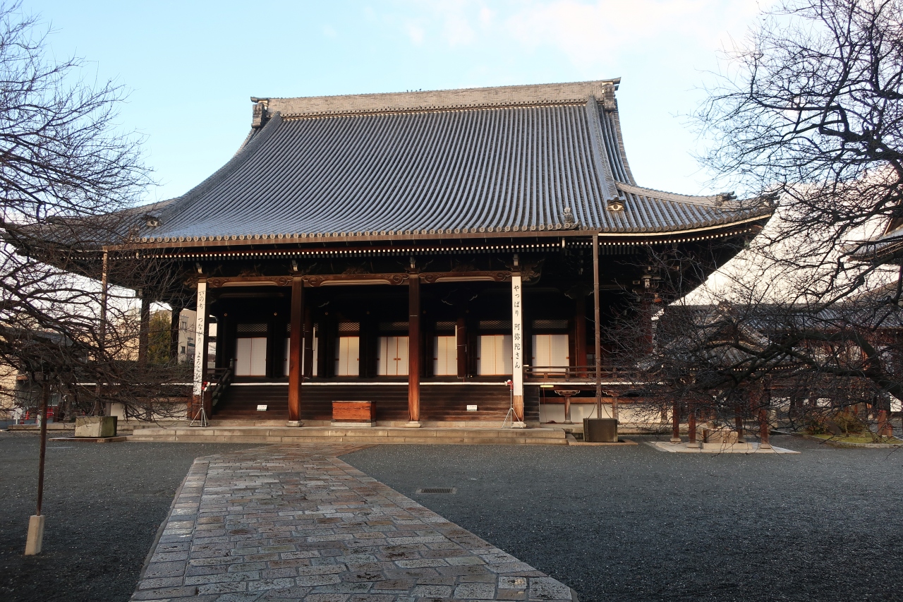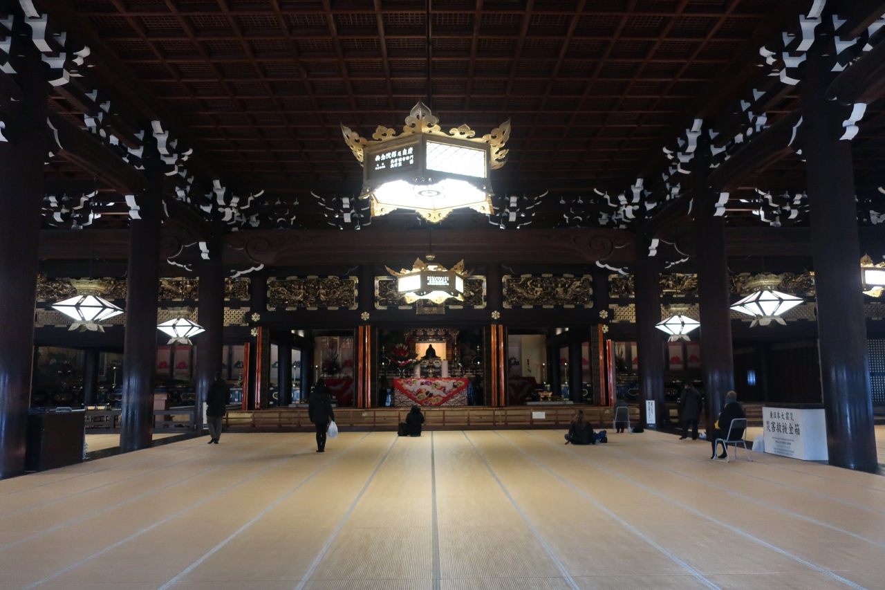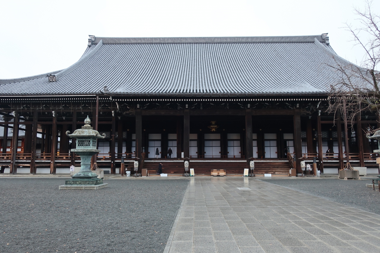 西本願寺の境内にある2つ大きな建物があります。その右手側にあるのが阿弥陀堂です。1760年に建てられた瓦ぶき入母屋造りの超巨大な木造の建築物。兎も角その大きさに圧倒されます。外陣の見応えもさることながら、数百畳もある内陣には直径1m以上もある巨大な柱が支えていることが見て取れます。