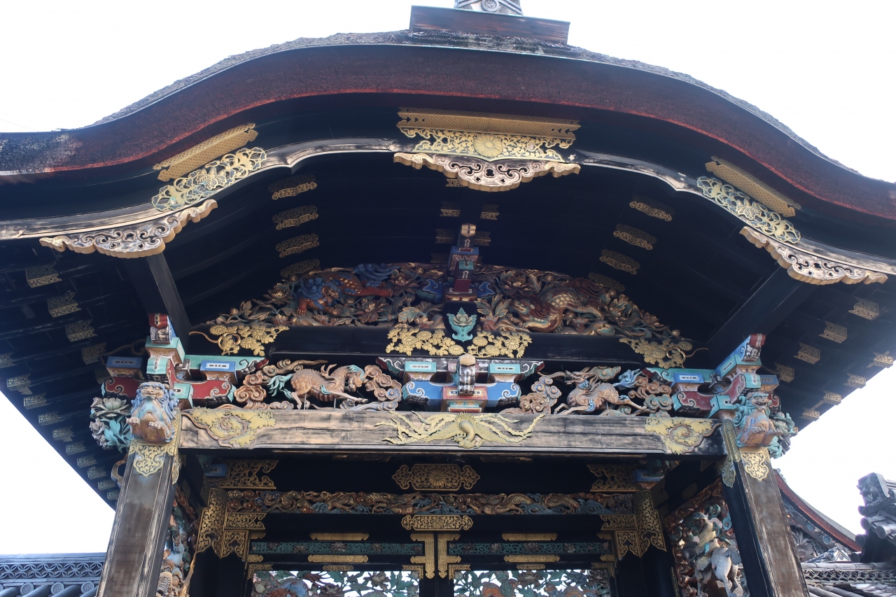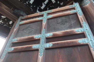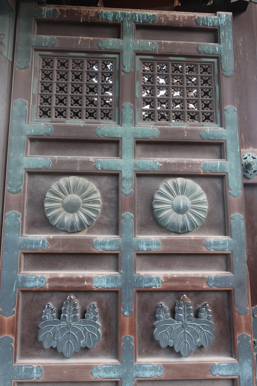唐破風屋根のとても立派な四脚門で、扉は金の金具で飾られ、門横には菊?、牡丹?の見事な透かし彫りが施され、唐破風屋根には瓦も乗せられており、他の寺社ならば唐門と言っても過言ではない程、絢爛豪華な門です。