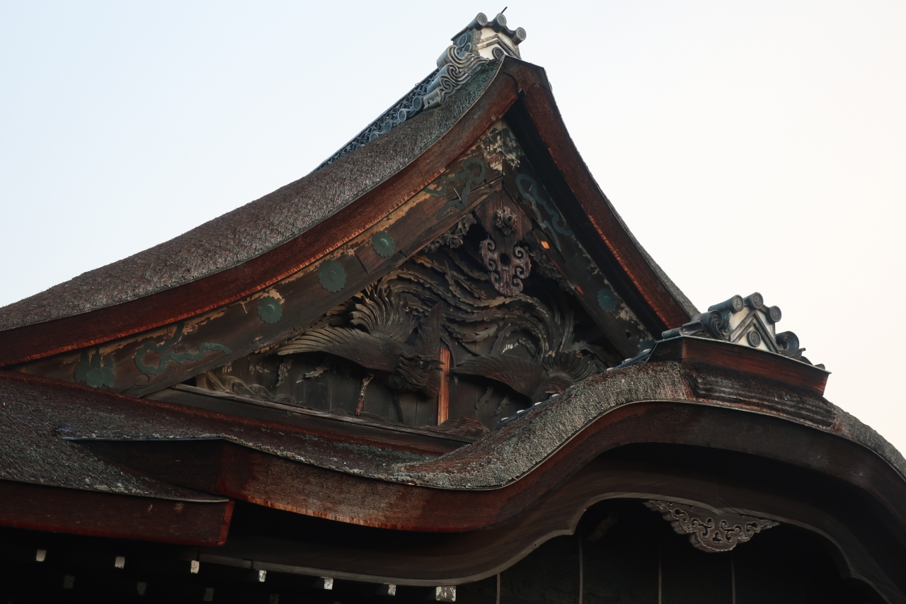 東本願寺の烏丸通り沿い南側に位置する門が阿弥陀堂門です。切妻造、檜皮葺の唐破風屋根を持つ明治期に作られた四脚門です。門扉には大きな菊、桐の御紋が嵌められ皇室と関係があったことを窺わせます。また、門柱の金具にも獅子の彫刻が施され、明治期の作られたとは思えない見事な門です。