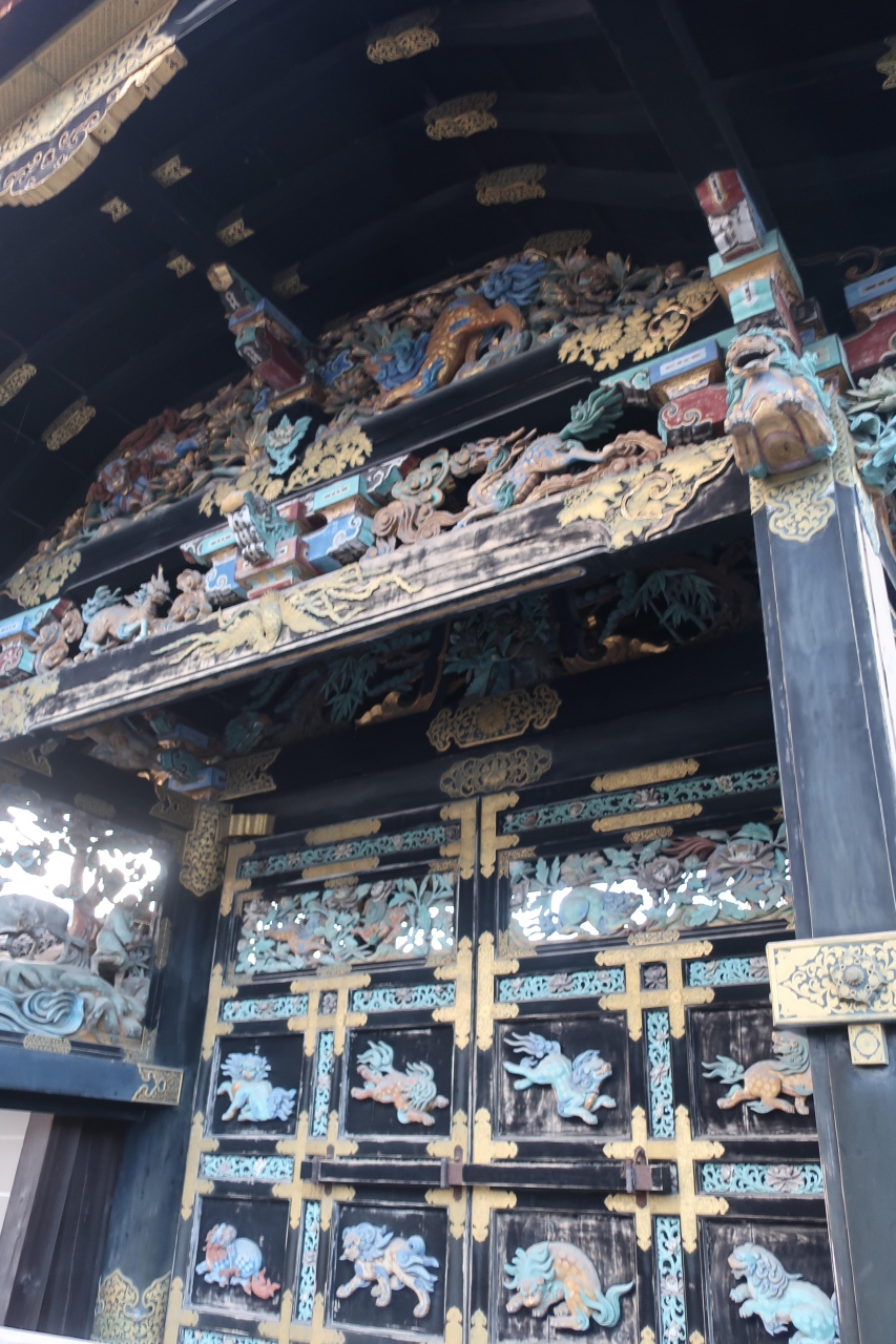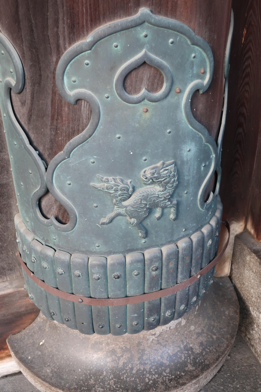 また、門自体も中央に下げられた煌びやかな燈篭、青い扉の金具、門扉に嵌め込まれた菱型の意匠などじっくり見ると、色々と細部に細かな飾りが施されており見ごたえがある門です。
