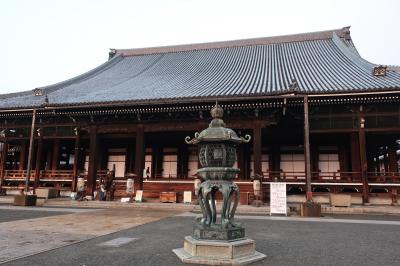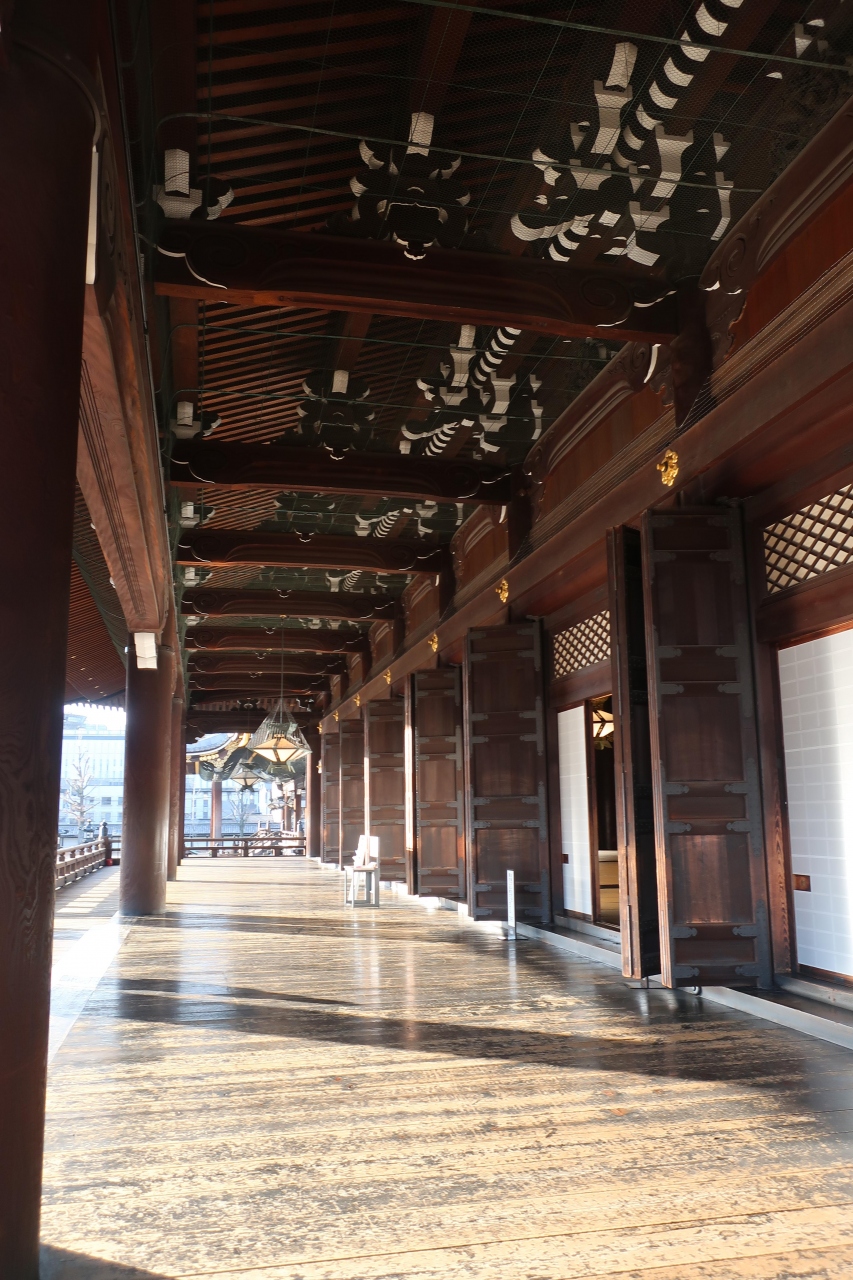 西本願寺の境内にある2つ大きな建物があります。その左手側にあるのが御影堂です。親鸞聖人の木像を祀るお堂で、こちらも巨大な木造建築物です。驚くのは、こんなにも大きな建物なのにどこもかしこもピカピカに磨かれています。朝早く訪れたので、信徒の方が雑巾がけをしている姿を見ることができました。この様な光景が見られるのも本願寺ならではです。