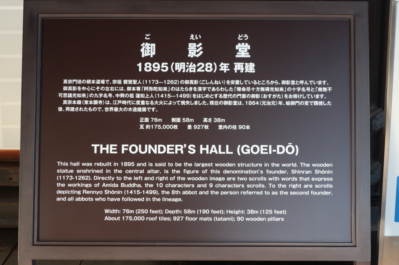 東本願寺の境内には阿弥陀堂と御影堂と2つの大きな建築物がありますが、その北側にあるのが御影堂です。二層の入母屋造りの世界最大の木造建築物です。こちらも明治期に16年の歳月を再建された木造建築は圧巻です。内陣に上がって柱を見れば分かりますが、今ではこんな建物を建てる木材はないので、二度と作れないのではないでしょうか。
