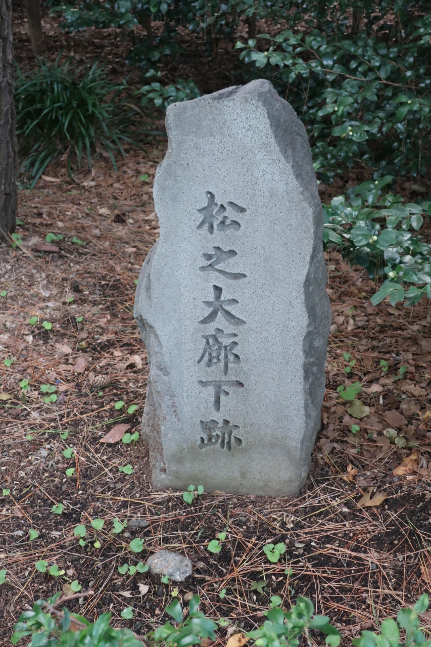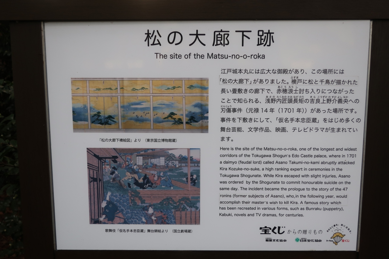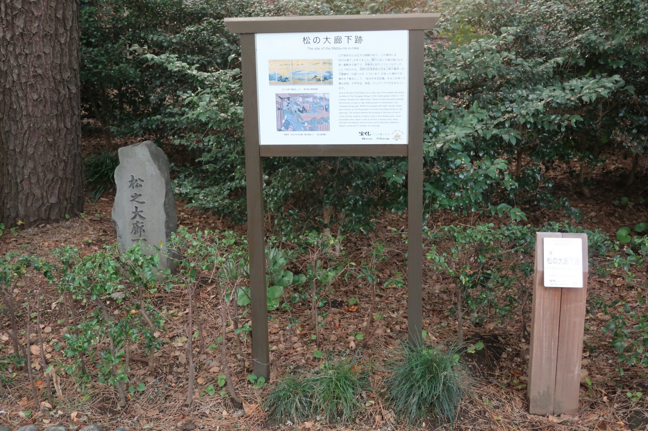 皇居東御苑の蓮池濠側の植え込みの中に松の廊下跡があります。そう、忠臣蔵で有名な浅野内匠頭長矩が吉良上野介義央を切りつけた、あの松の廊下跡です。