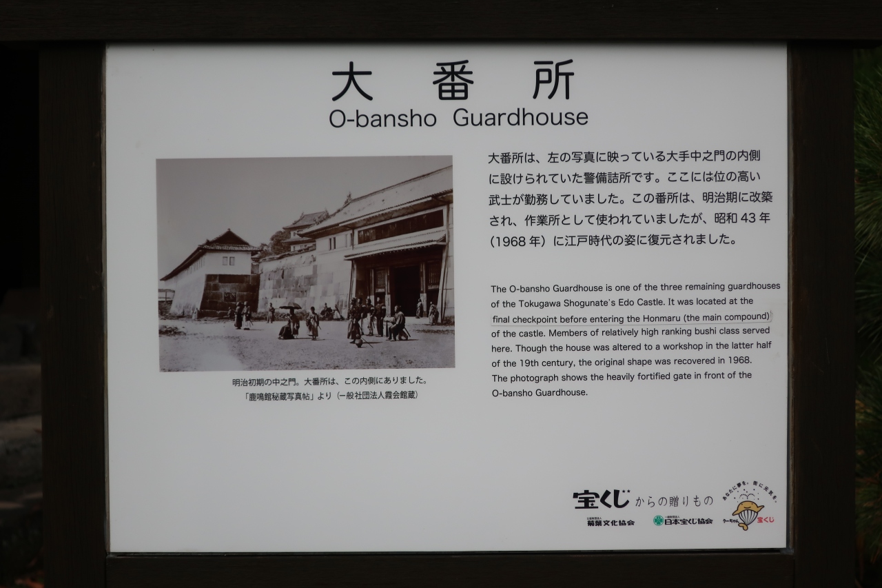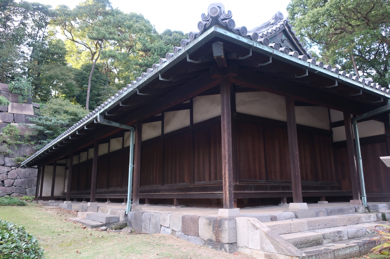 皇居東御苑の中之門から中雀門に上る坂道の途中にある警備の詰所が大番所です。一見古そうな佇まいですが、昭和41年に復元された建物で、雨戸も閉められており中も見られません。注目すべきは大番所の裏に見える15段の石段。射撃用に設けられた石段で、こんな所にも防御の仕組みを見られるのが面白いです。