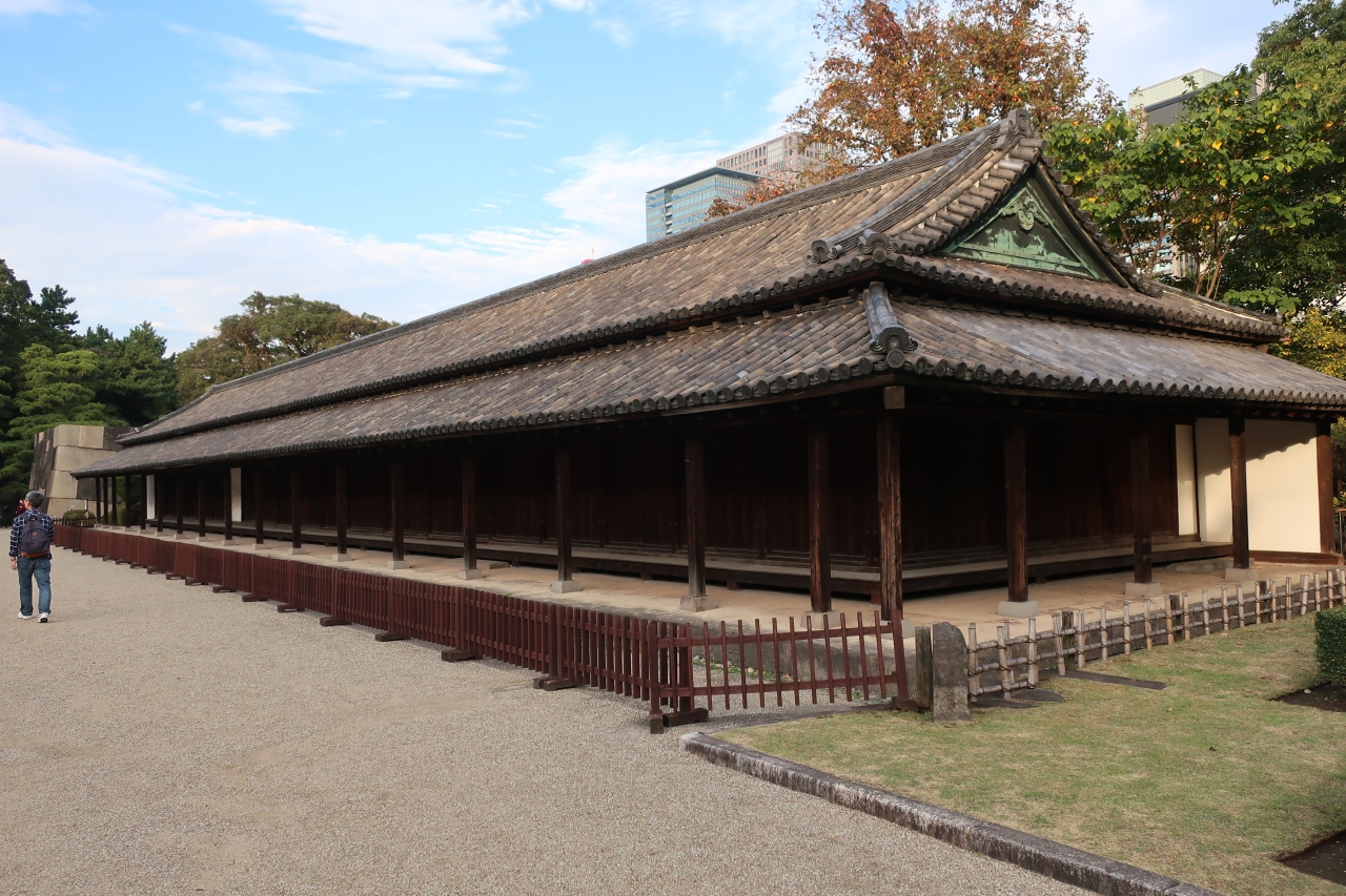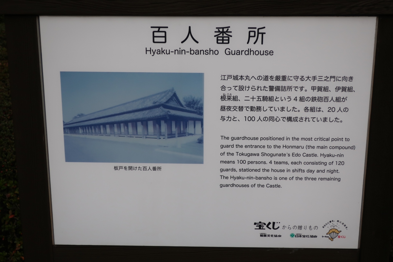 皇居東御苑の中之門の対面に長さ50mを越える横長い長屋の様な建物があります。これが江戸城警護のために設けられた最大の番所、百人番所です。