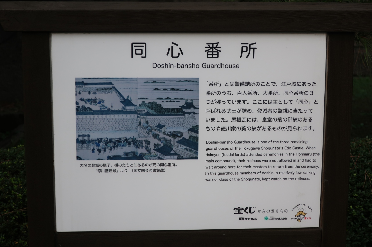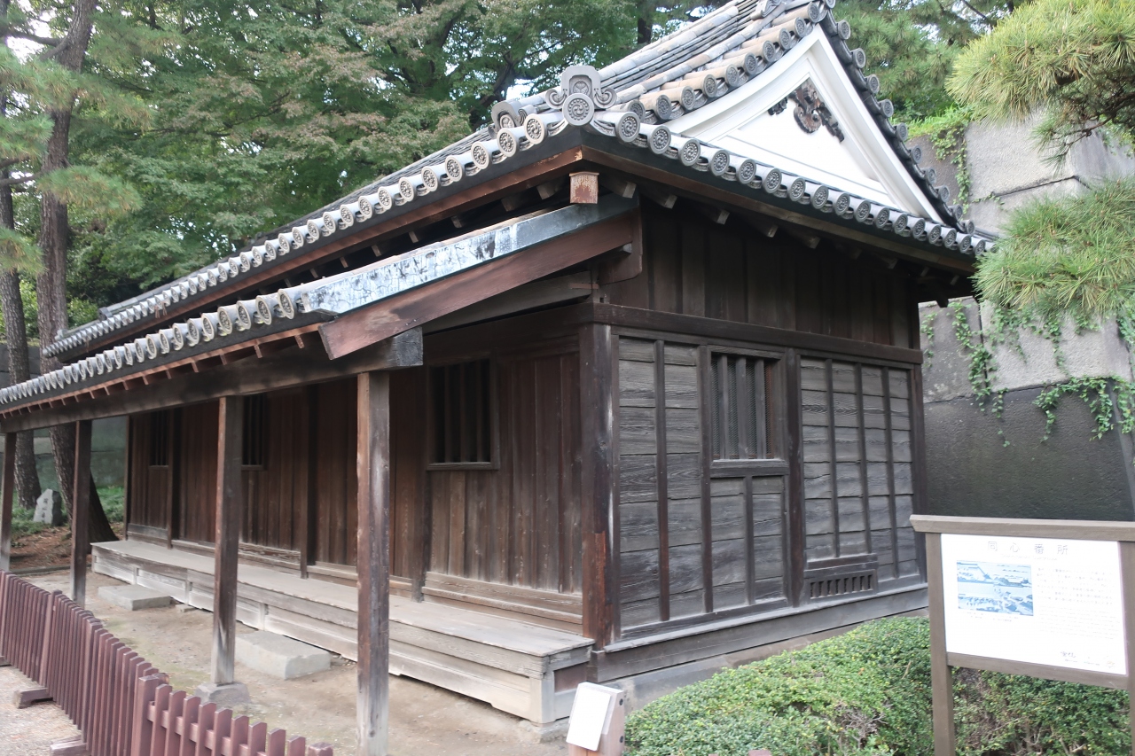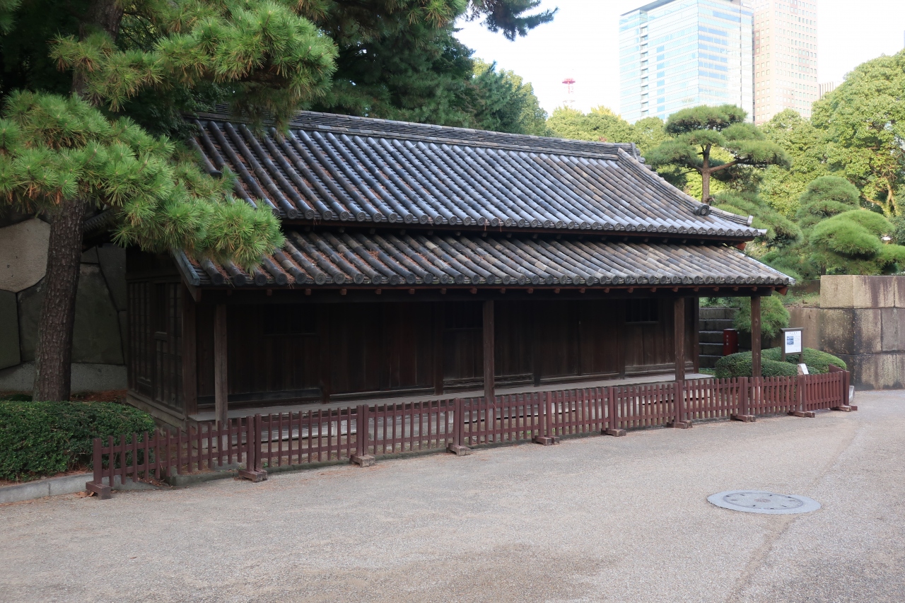 皇居東御苑の大手三の門 枡形の中に同心番所があります。旧江戸城にあった3つの番所で一番最初にある警護所です。防御設備である枡形の中に番所があるのは変だなと思っていたら、元々は大手三の門の大手門側に、濠に架かる橋があり、その袂に同心番所はあったそうです。