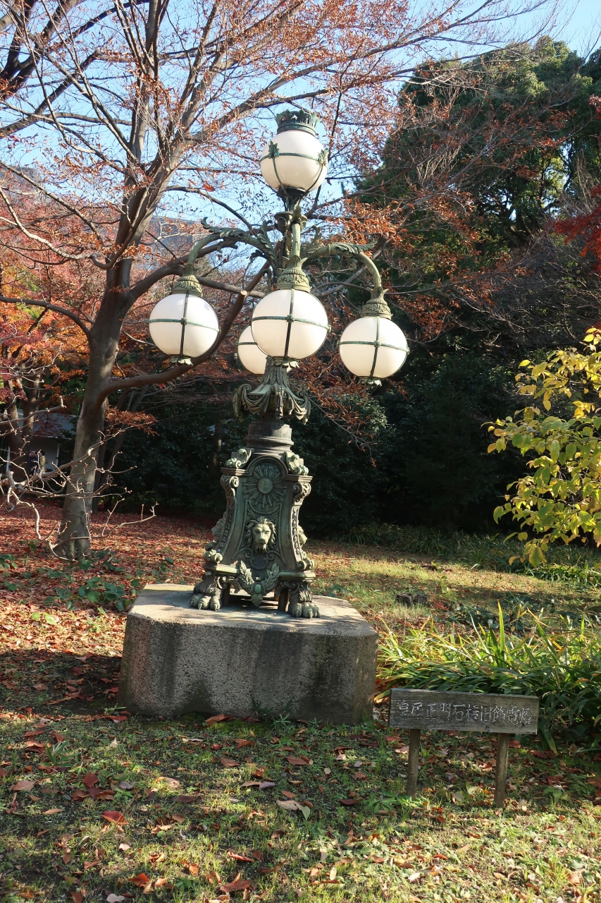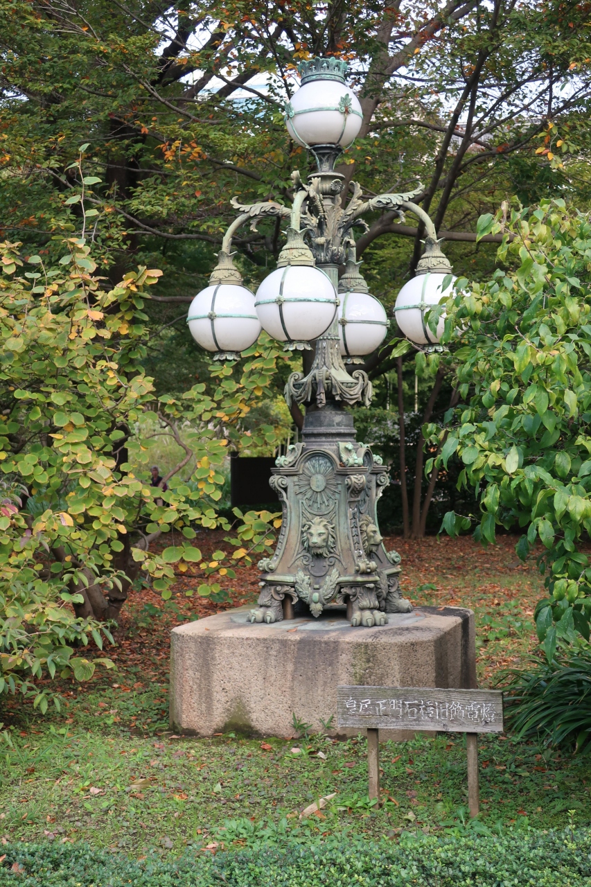 皇居東御苑の二の丸庭園の白鳥濠の前辺りの植え込みの中に、何気なく皇居正門石橋旧飾電燈が置かれています。明治期に作られた電燈はとても手の込んだ造りで、下部には獅子の顔、台座の足はその獅子の爪、そして旭日の意匠が施され、電燈はサクランボの様に吊り下げらられています。