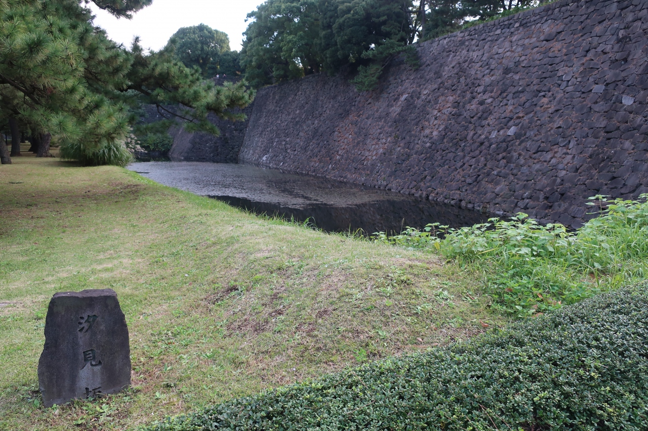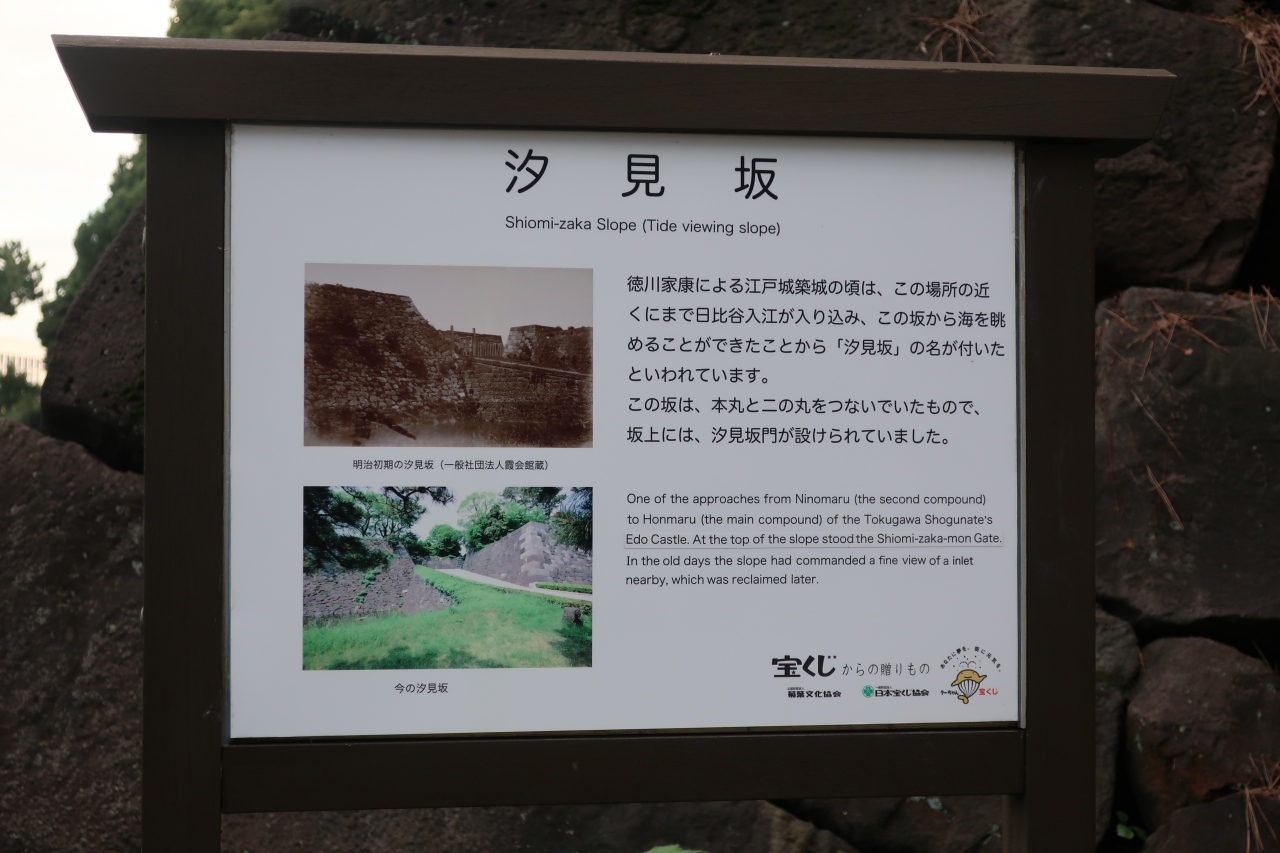 皇居東御苑の二の丸から本丸に上る坂道です。大番所側の登城口とは違い、急こう配の坂道。名前の通り築城当時はこの坂から日比谷の入り江を見ることが出来たそうですが、今は大手町のビル群が二ノ丸越えに見渡すことできる眺めの良い坂です。坂上には汐見坂門の跡が残っています。