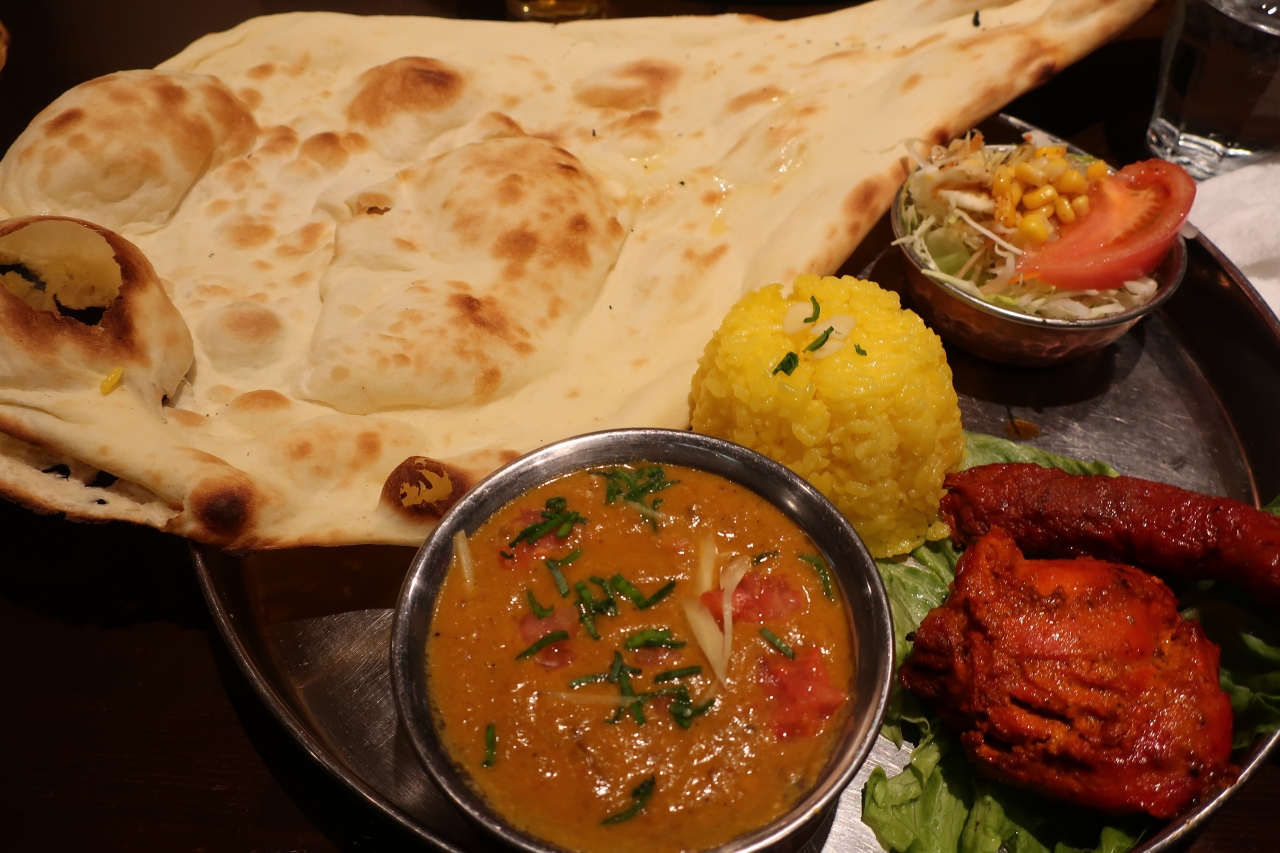 セットメニューも数種類あり、今回頂いたのはタンドリーミックスセット(カレーはマトンの挽肉が入ったキーマ マター カレー)。タンドリーチキン、シシカバブ、サラダ、サフランライス、ナンが付いて1980円。ナンは大きく、まろやかな味のカレーを付けて食べる味は本格的です。