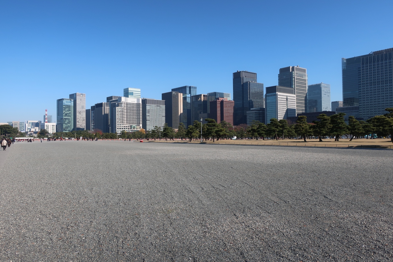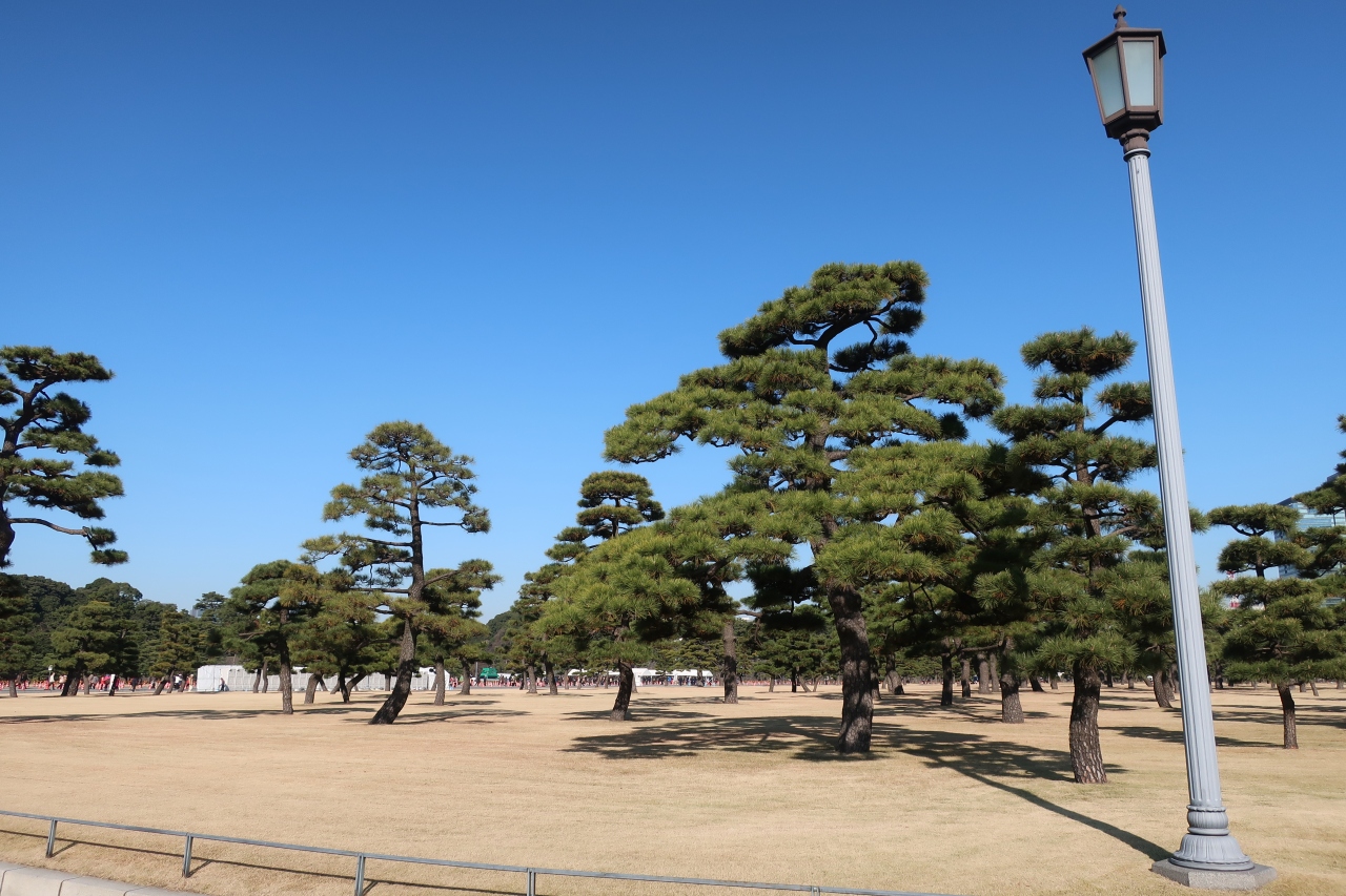 皇居二重橋前に広がる松の木が植わる植林帯と砂利の敷かれた広い通りとからなる広大な広場です。