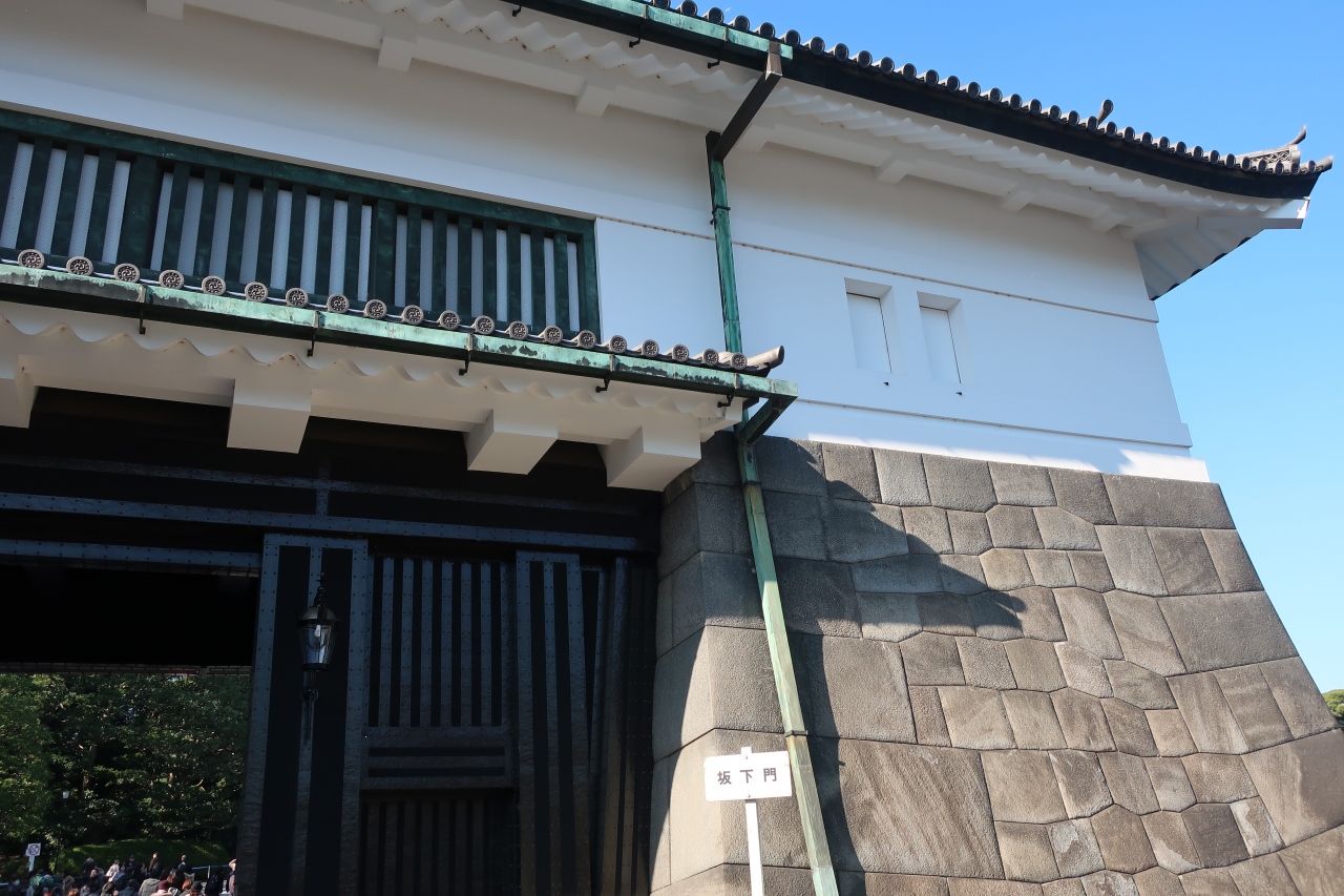皇居 西の丸にある宮内庁の出入口となっている櫓門です。普段は厳重に皇宮警察によって警備されており、入ることが出来ませんが、乾通りが公開が公開される秋の一週間は入場門として坂下門を通り抜けることが出来ます。