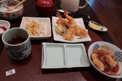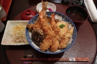 店内はL字型のカウンター席と4人掛けのテーブル席が2つと余り大きなお店ではありませんが、とても清潔感があり落ち着いた雰囲気です。頂いたのは天丼と天ぷら御膳。天丼は海老2,イカ1,魚1,野菜3が乗り甘辛いタレが絶妙です。天ぷら御膳の天ぷらもサクサクで、塩、タレどちらで頂いても美味。