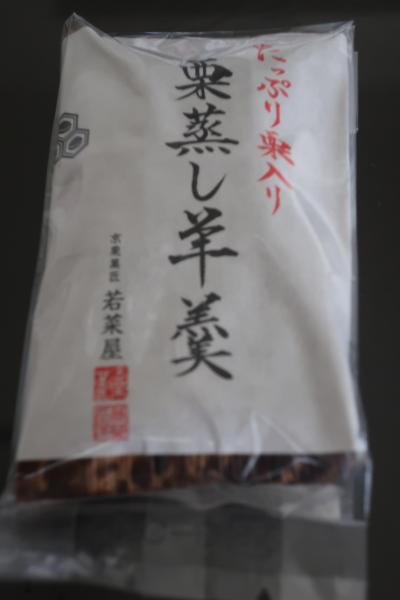 千本丸太町交差点を東に入った所に若菜屋の本店があります。栗を素材にした和菓子を扱うお店です。栗蒸し羊羹を買いました。ラベルに書いてある様にたっぷり栗が入った羊羹は、高山の栗よせに引けを取らない程美味しい味です。