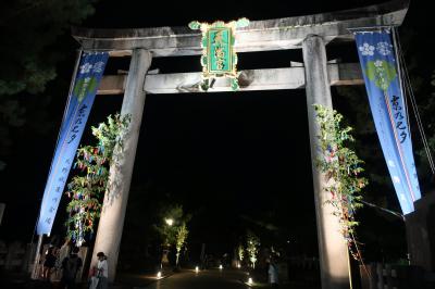 北野天満宮の参道の入口、今出川通りに面した場所にある石造りの大鳥居です。夜に北野天満宮に来たことはなかったのですが、京の七夕で天満宮を訪れ、改めて漆黒の夜にライトアップされ浮かび上がる大鳥居の迫力に少し圧倒されました。昼来た時にはそんなに大きいとは思わなかったでの驚きです。