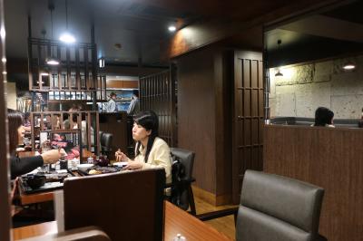 自由が丘駅の正面ロータリーのバス停の後ろ、藪伊豆の2階にある、ハンバーグとステーキのお店です。店内の雰囲気はモダンな店で座席は椅子ではなく、2人掛けの固めのソファー。土曜日の19時過ぎに行きましたがほぼ満席の様でした。
