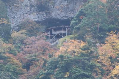三徳山投入堂遥拝所から見た投入堂がこちら。肉眼でも見辛いので、私は単眼...