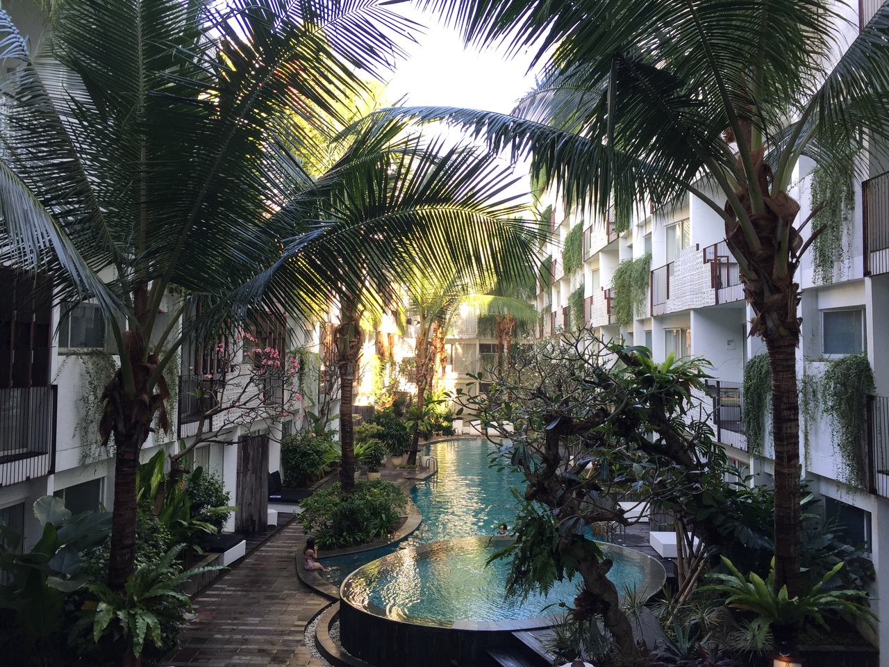夫婦と4歳の子供1人の3人で4泊しました。場所はレギャン通りに位置し、買い物、食事、マッサージ、ビーチに行くにも便利で、立地は最高でした。周辺は繁華街ですが一歩ホテルに入ると静かです。日本語は通じませんが、スタッフは皆親切で、子供にもよく声をかけてもらいました。オープンテラスの朝食会場は雰囲気が良いです。料理の種類も割と沢山あり、その場で目玉焼きやオムレツも作ってくれます。プールは1階と屋上にありますが、1階のプールは中庭にあるのでキレイですが日当たりが悪く、昼間でも水温が少し冷たいです。屋上のプールはヨーロッパ系の宿泊客が日焼けをしている姿が目立ち、子連れで浮き輪で遊ぶのは少し気が引けました。プールバーも有り、雰囲気は良いです。総合的に特に悪いところはなく、機会があればまた利用したいです。
