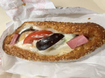 揚げパンには厚めのハム、煮たまご(台湾風の黒いもの)、トマト、キュウリが入っており、それに台湾風の甘いマヨネーズがたっぷり。パン甘さと台湾風マヨネーズは昔と変わらず。カロリーは気にせず食べたい。- 旅行時期
