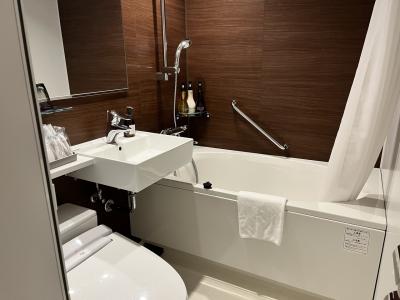 部屋は東横インのスタンダード、電源・WiFiの問題なし。お風呂もゆったり入れるし、スーツケースがしまえるベッドである。