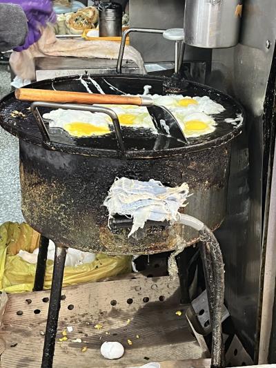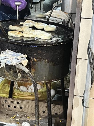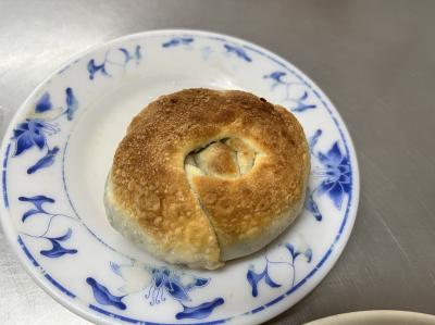 また、もうひとつの名物は蛋餅。蔥油餅に卵を鉄板で焼きつけるスタイル。葱餅の上に玉子焼きがのっていて、カリッとしていて美味しい。