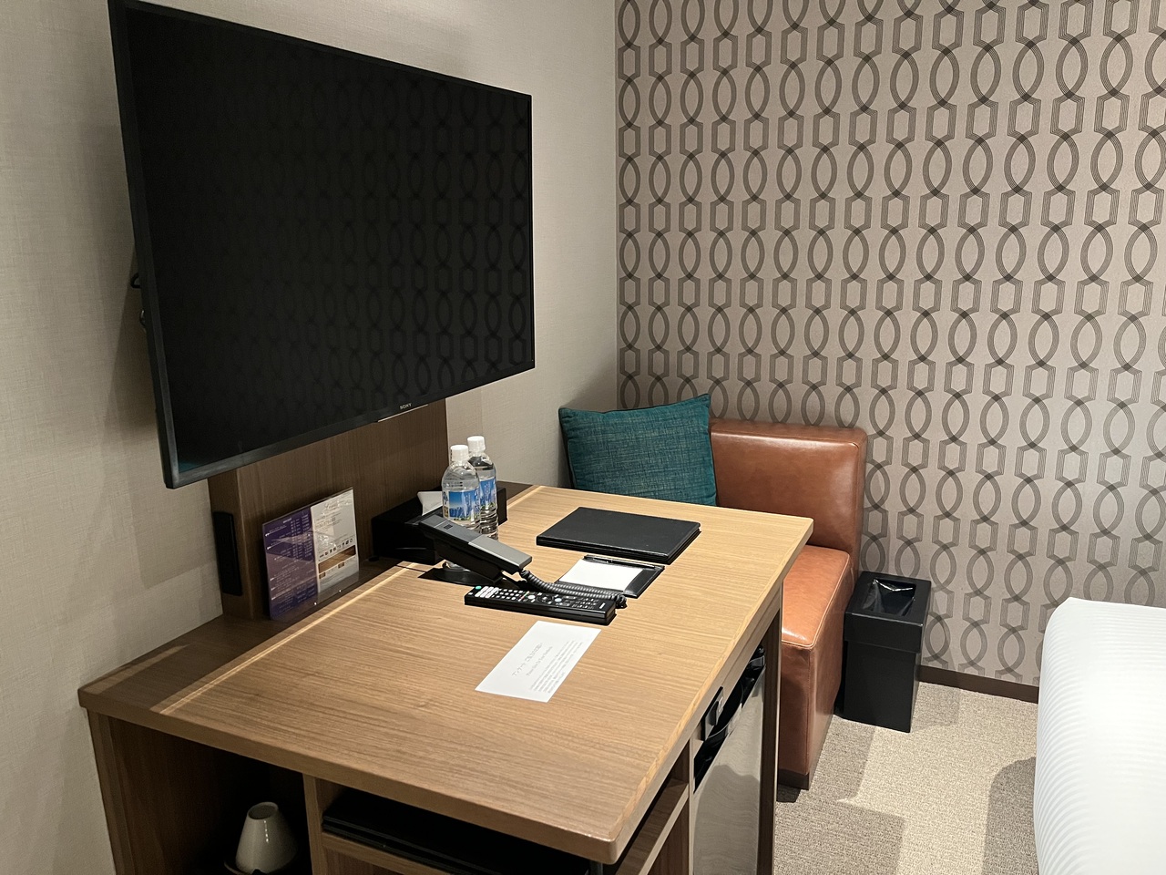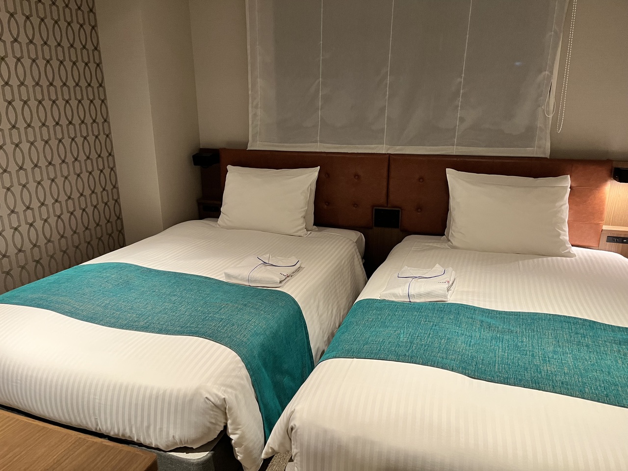 ツインルームに宿泊。ベッドは標準サイズであるが、寝心地の良いベッドであった。また大き目のてーびすは2名での仕事が可能なサイズで電源等もしっかりしており、部屋での仕事が非常にしやすかった。