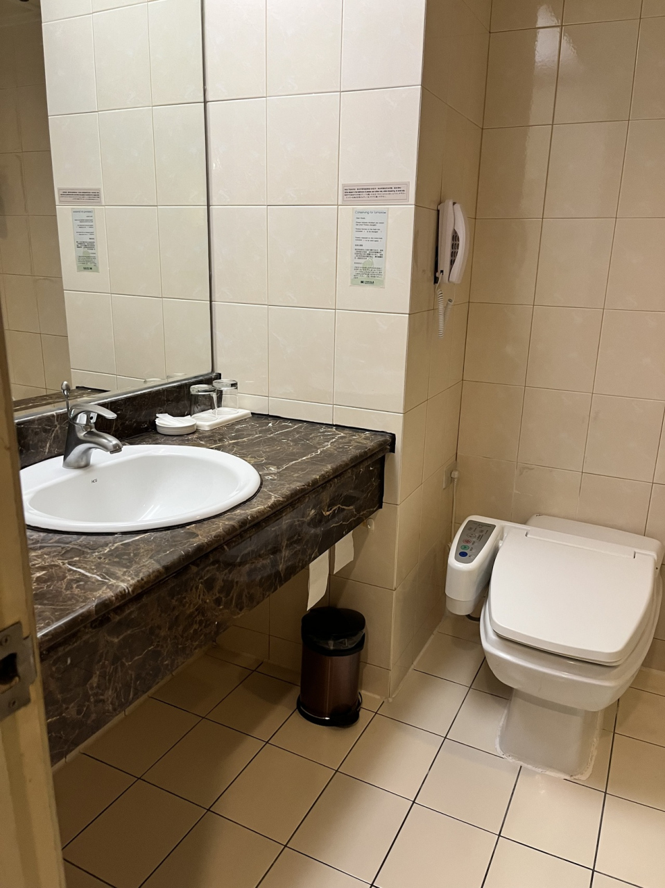 窓が大きく、明るい部屋。ただし光が入るので部屋はエアコンが若干効きづらい(そのためなのか扇風機も置いてあった)。また、設備は若干古いがトイレはウオシュレット付(ただし、紙を流すのはNGらしい)、バスタブも日本人に嬉しい深さ。
