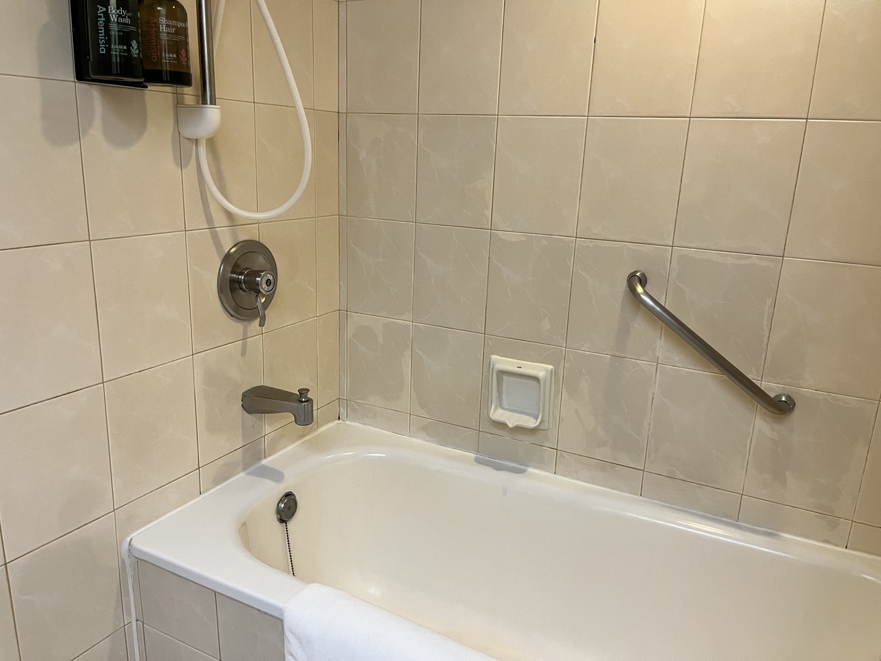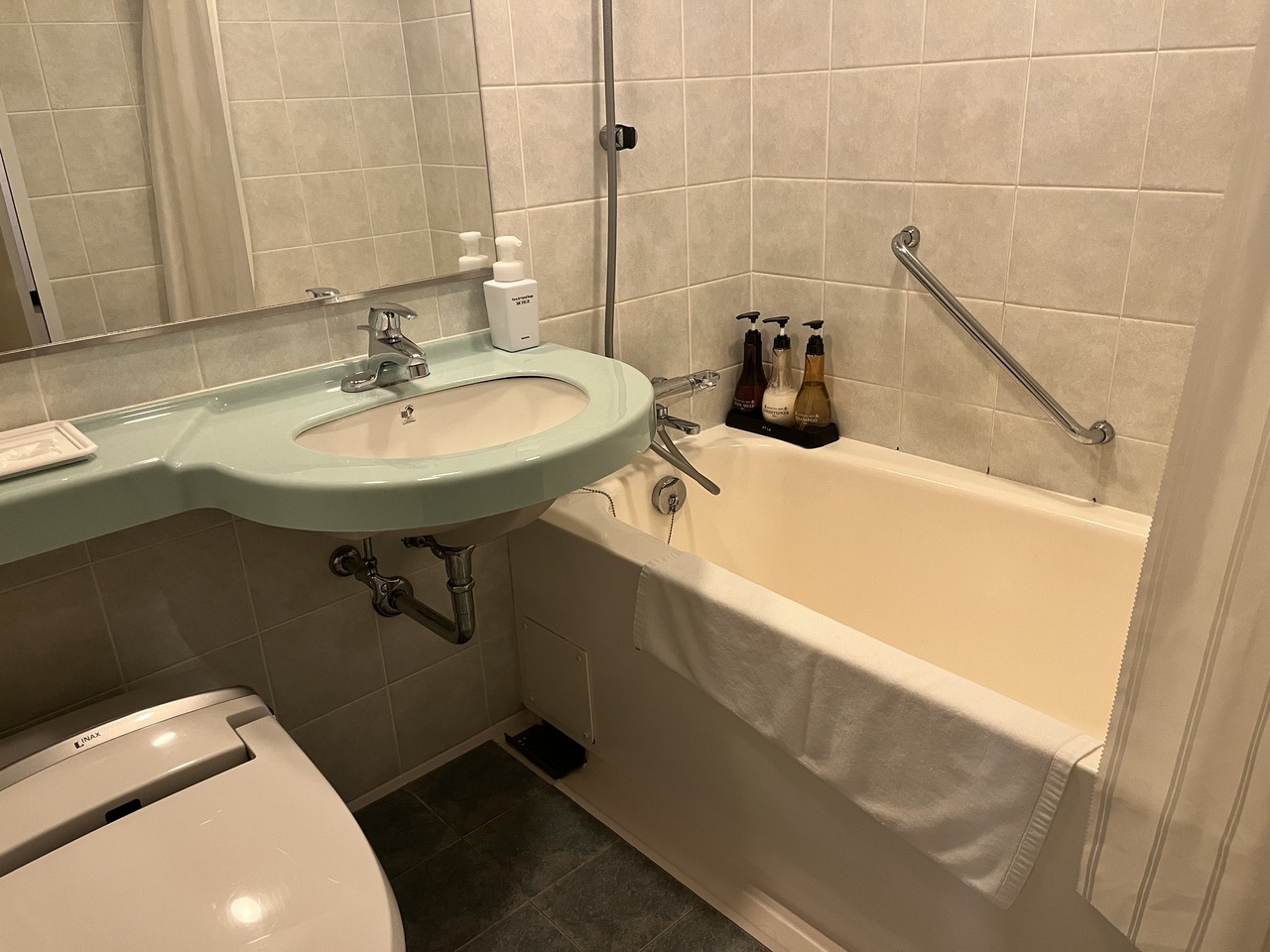 テレビは日本番組のチャンネルやNHKワールド・プレミアムの視聴も可能。バスタブは大き目で新しいものに交換されていた。シャワーは塩素を除去するフィルターが付いており、アメニティも充実していた。