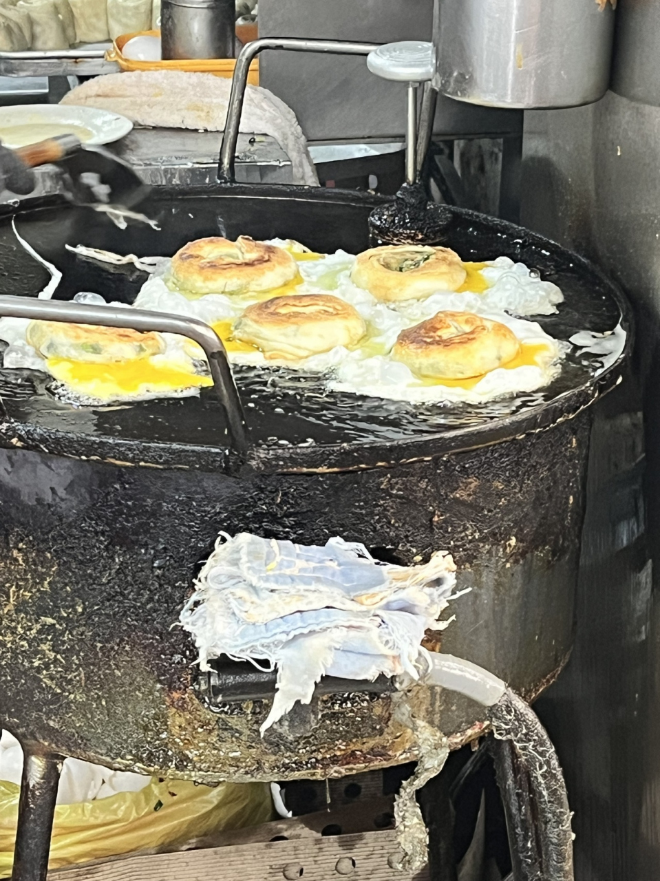 また、もうひとつの名物は蛋餅。蔥油餅に卵を鉄板で焼きつけるスタイル。葱餅の上に玉子焼きがのっていて、カリッとしていて美味しい。