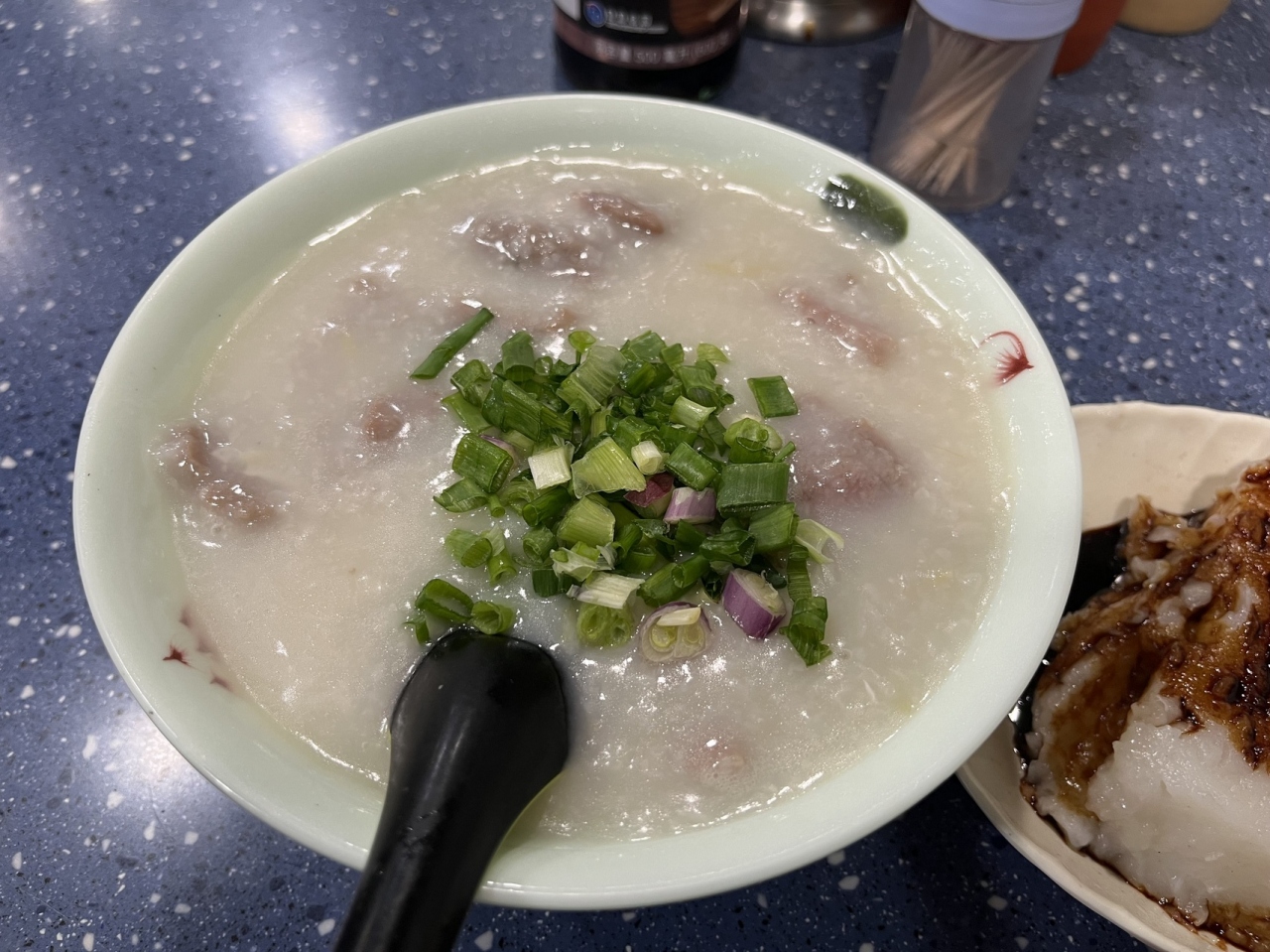 肝心のお粥は日本風。青葱がトッピングされているのが唯一台湾風なのかも。シンプルなお粥なので濃いめの牛皿と一緒に食べるのもよいかも。