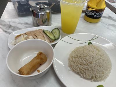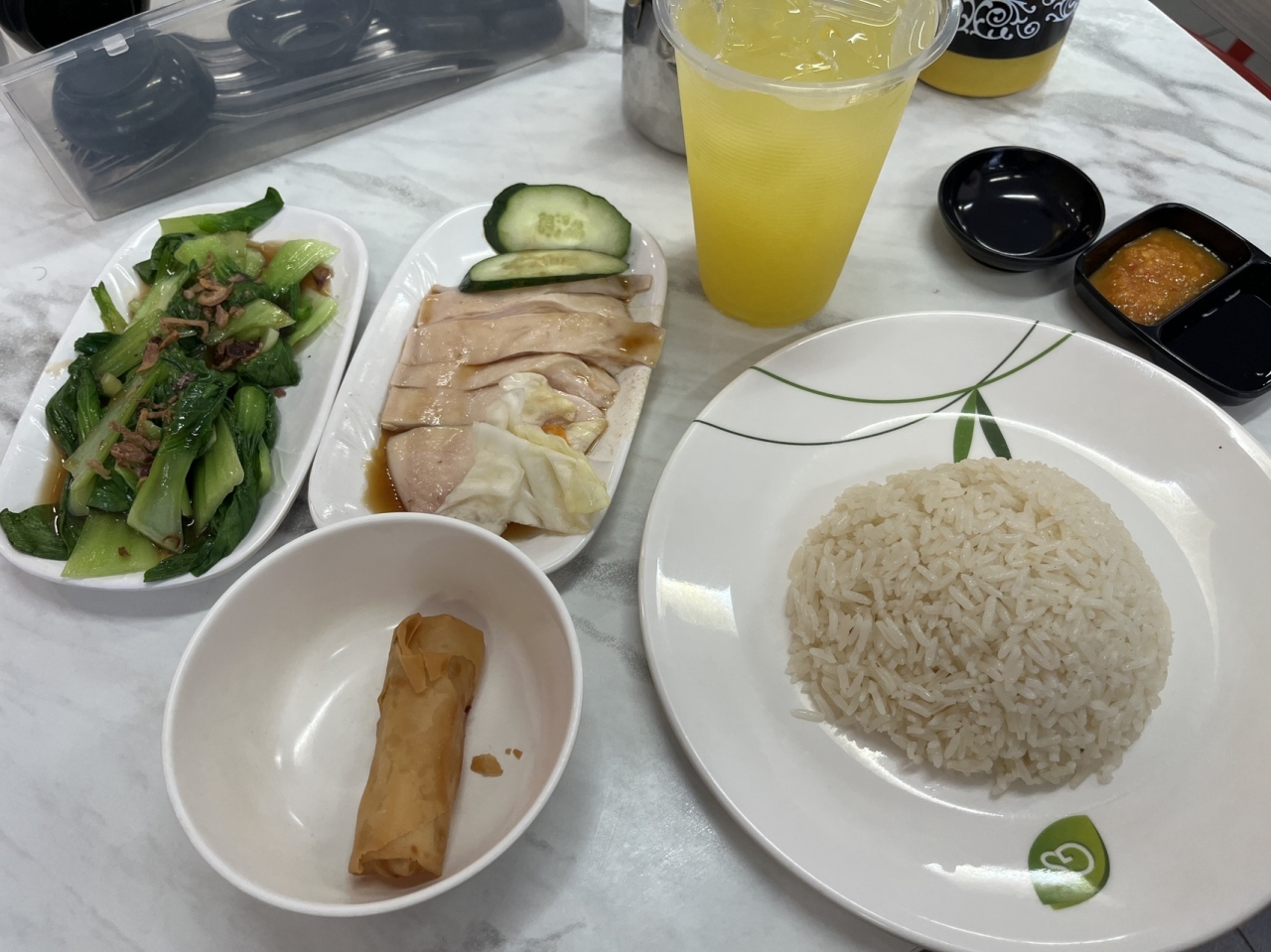 正当なチキンライスも良いのだが、メニューの先頭にあった套餐(セットメニュー)を注文。蒸しチキン(ローストも選べる)、春巻き、蒸した青菜にオイスターソースをかけたもの、ライス(もちろんチキンスープで炊いている)がセットされている。