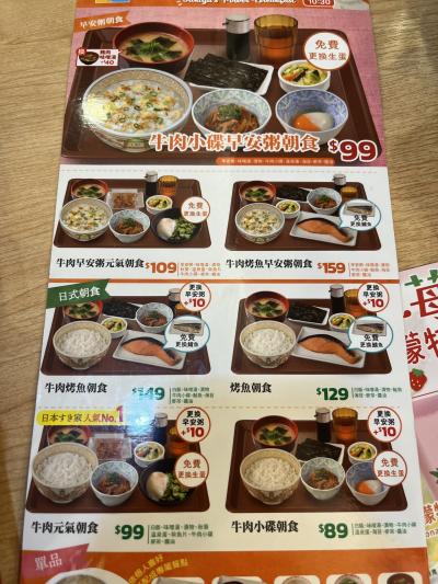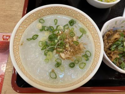 手作りコロッケがあるなど日本の店よりも多少メニューが多いのだが、朝食時間帯である朝5時から10時半までは日本でお馴染みの定食のほかに「早安粥元気朝食」と言うお粥セットがある。