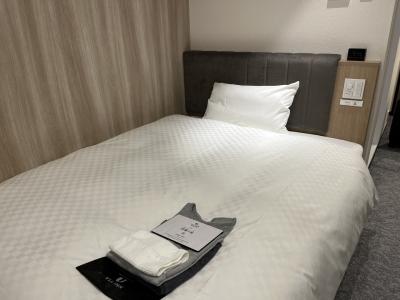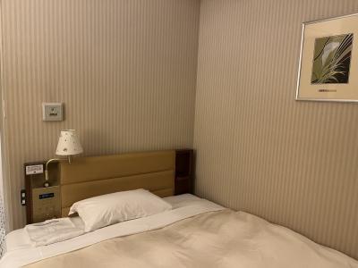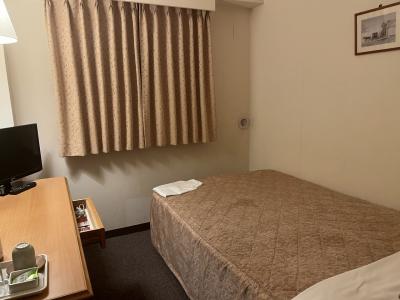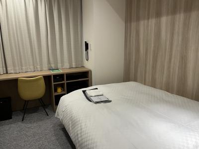部屋は落ち着いた内装。寝心地の良いベット、ちょうど良いサイズのテレビ、机が広めで仕事もしやすい。バスルームは小さめだが、広めの大浴場があるのでトイレと洗面所のみ使用。