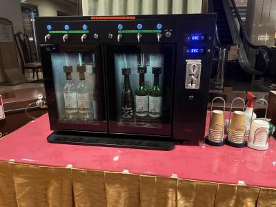 元々名鉄系のシティホテル(名鉄トヤマホテル)なので広々としたロビーや昭和の香りがするシャンデリアはビジネスホテルでは味わえない雰囲気。宿泊者にはコーヒーサービスだけでなく、ワインや日本酒の無料サービス(セルフだが)もある。