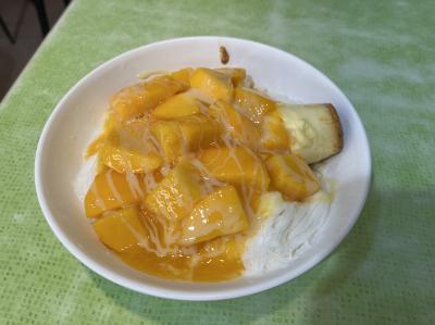 今回は布丁(プリン付)の芒果雪花冰(マンゴーかき氷)を注文。自家製と思われる布丁は少し固め。懐かしい味。布丁のトッピングは1個まで。夕方には熟れ切れているのでお早めに。- 旅行時期