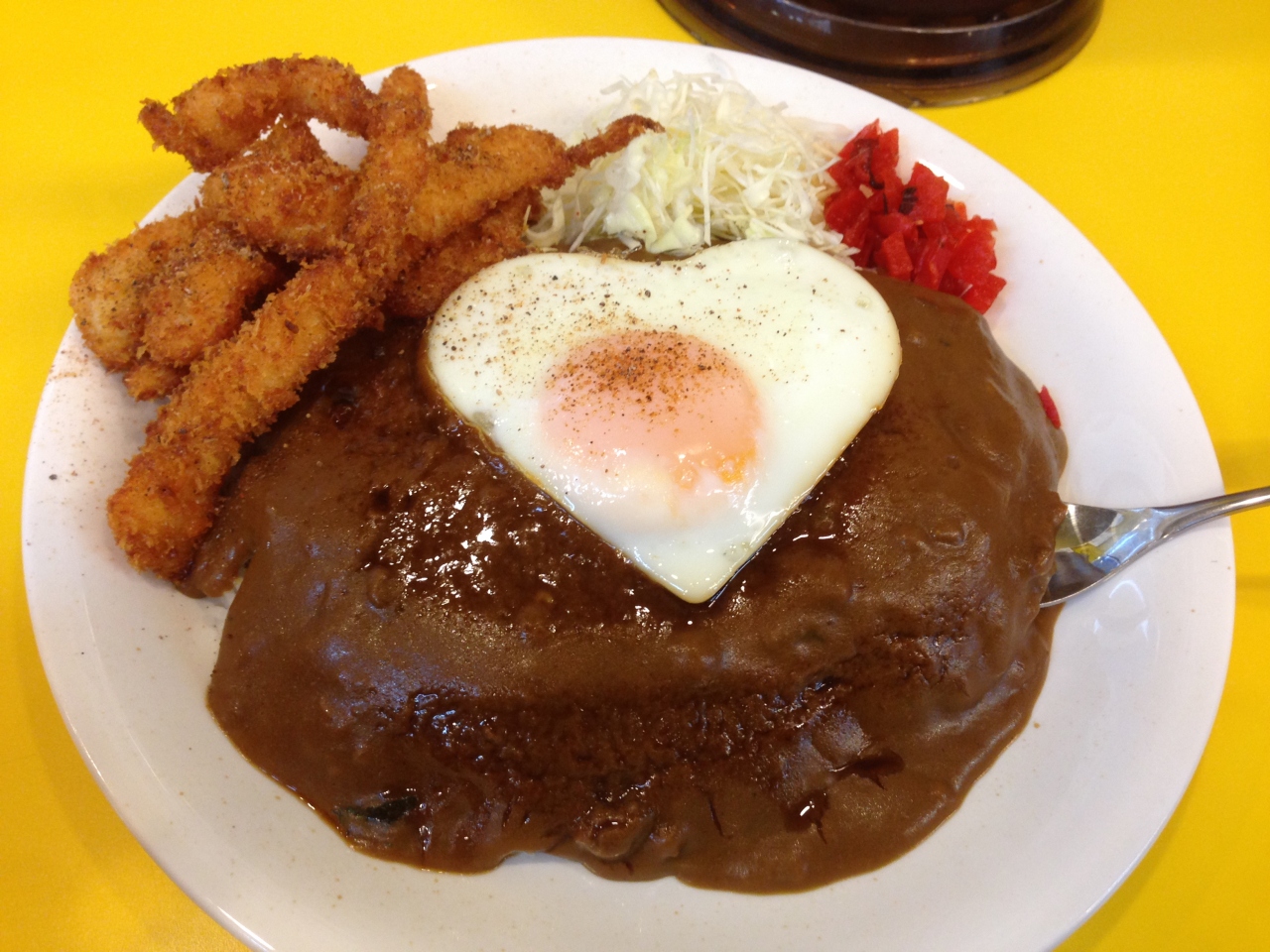 一番人気(と書いたあった)チキンカツカレーを注文。チキンカツはスティック状になったものを揚げていて細長いナゲットといった感じ。カレーのルーは黒くなく家庭で食べるカレーのイメージ。でも一応金沢カレーの感じはします。他の店と違うのはハート型の目玉焼きがのっているところ。カレーの味を中和させてくれる。